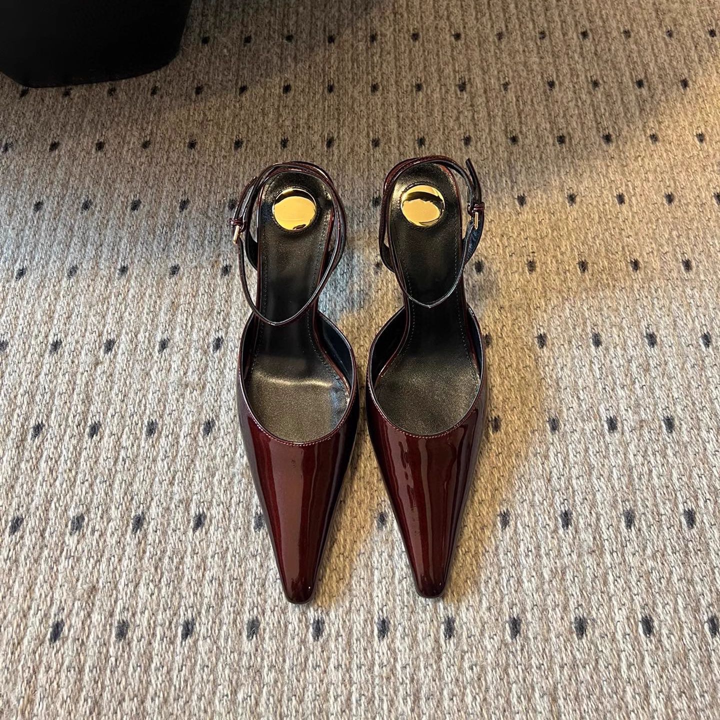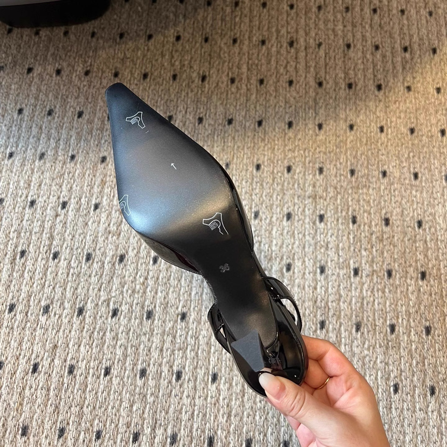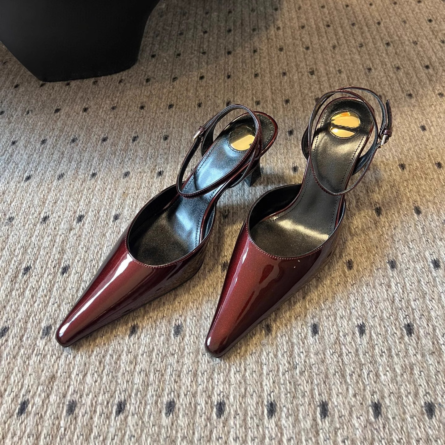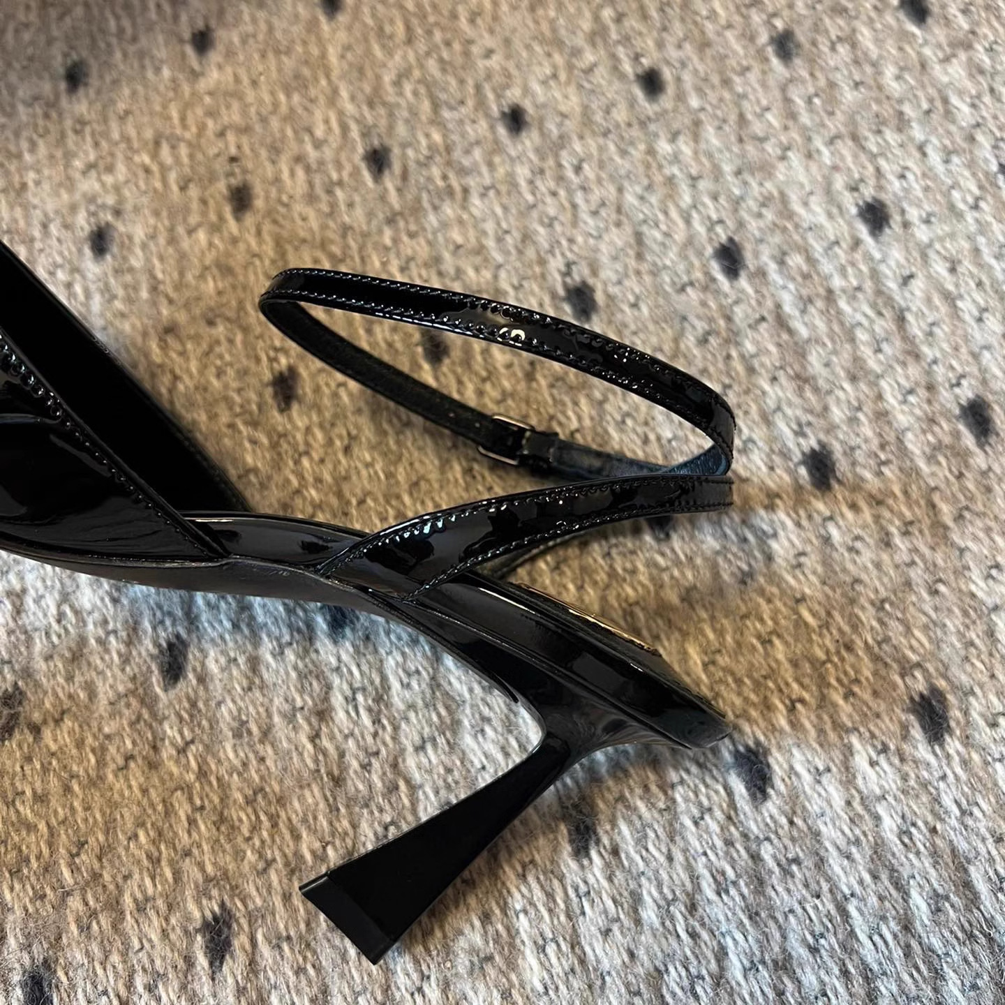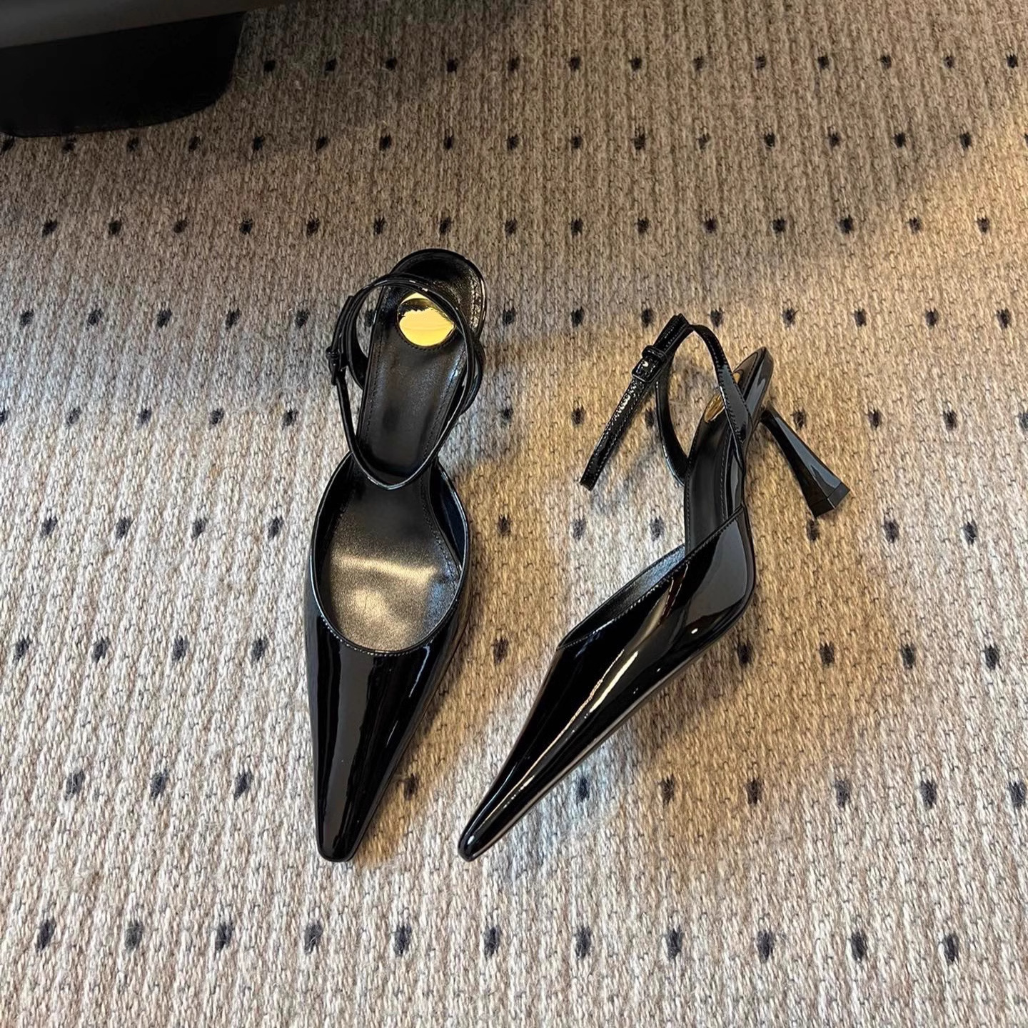 • 블랙 글로시 하이힐 포인티드 토 샌들, 굽 높이 약 7.5cm