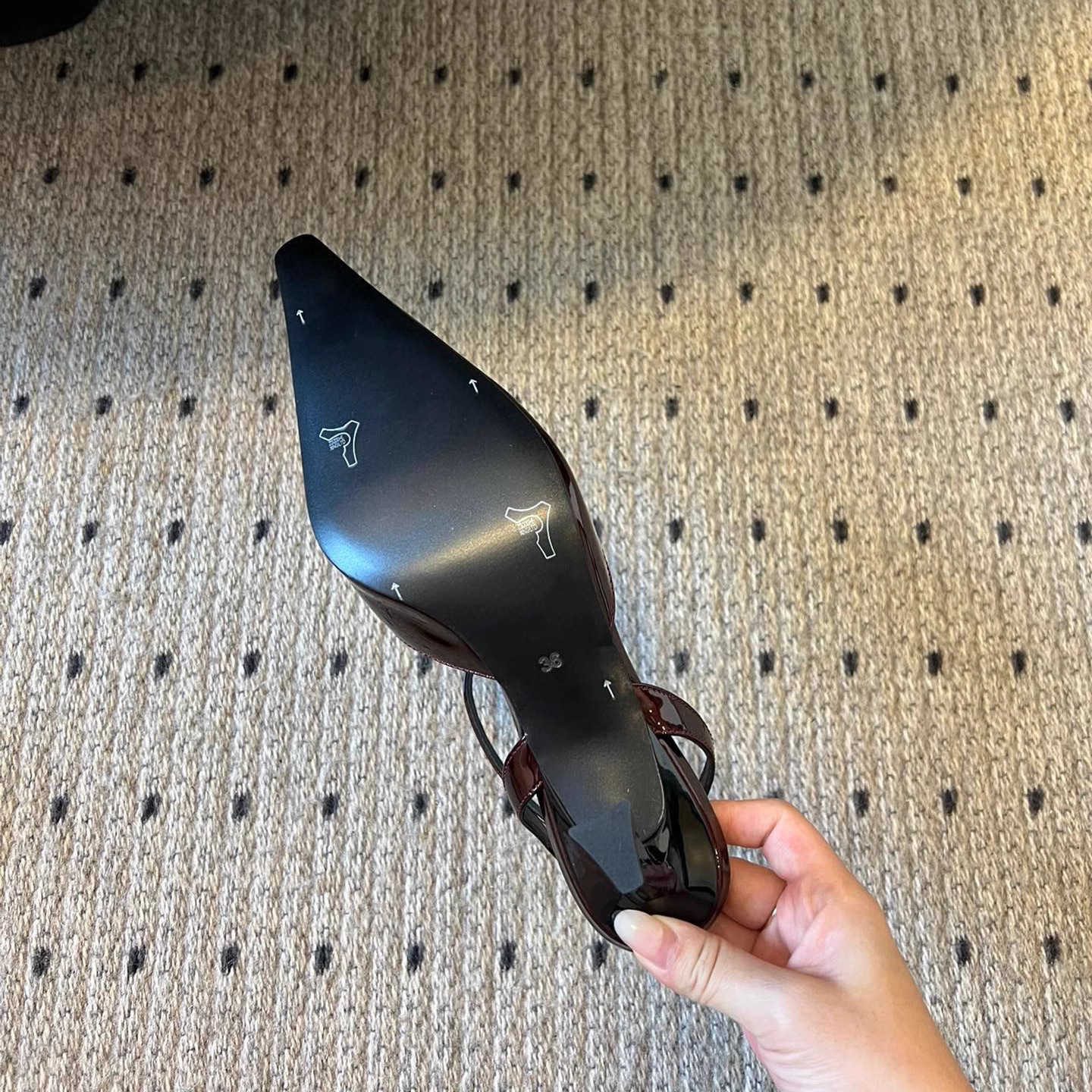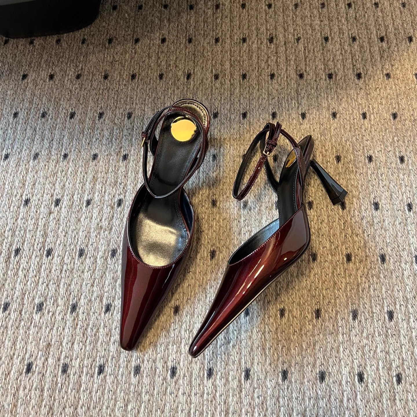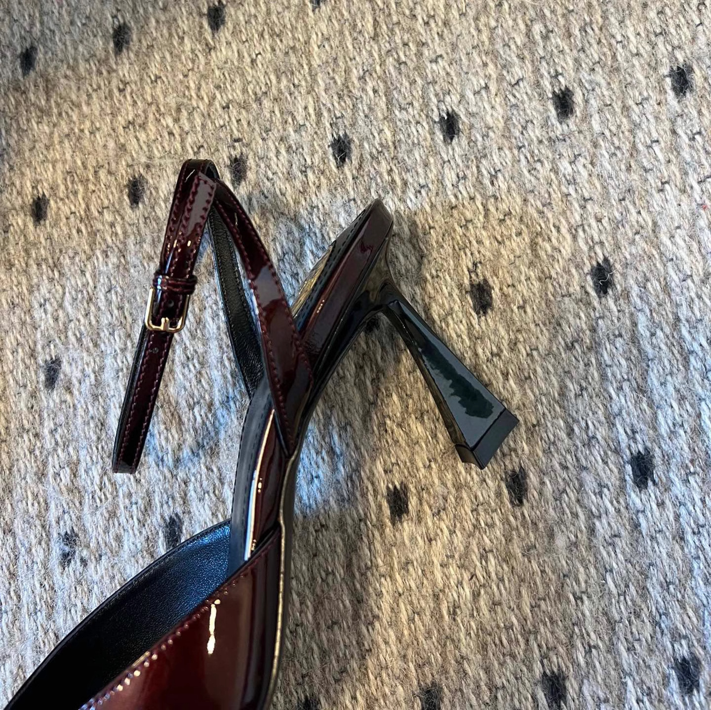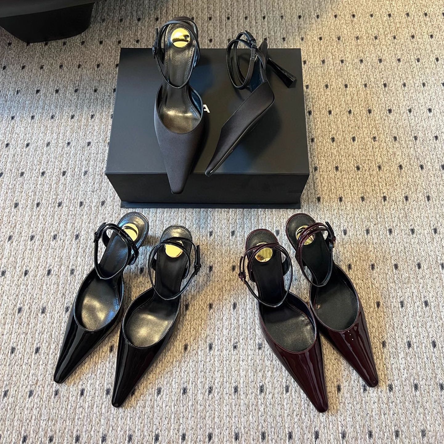 • 블랙 글로시 하이힐 포인티드 토 샌들, 굽 높이 약 7.5cm