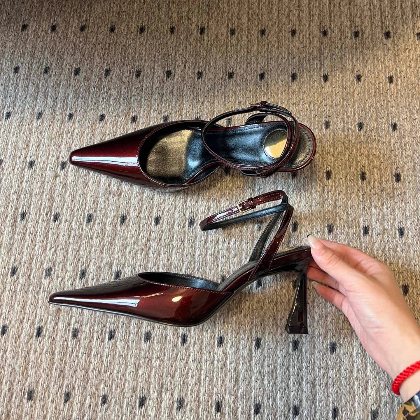 • 진한 빨간색 광택 하이힐 포인티드 토 샌들, 굽 높이 약 7.5cm