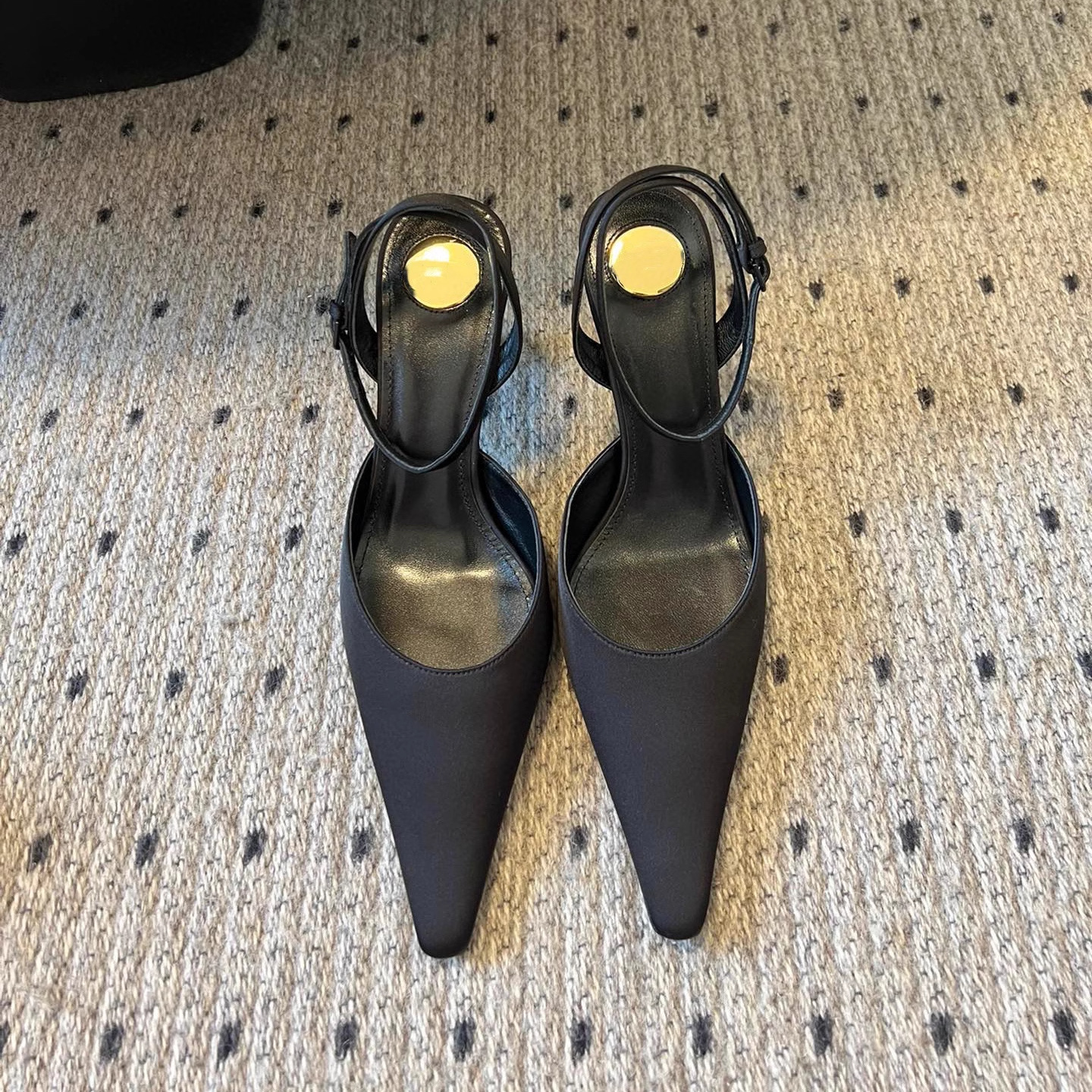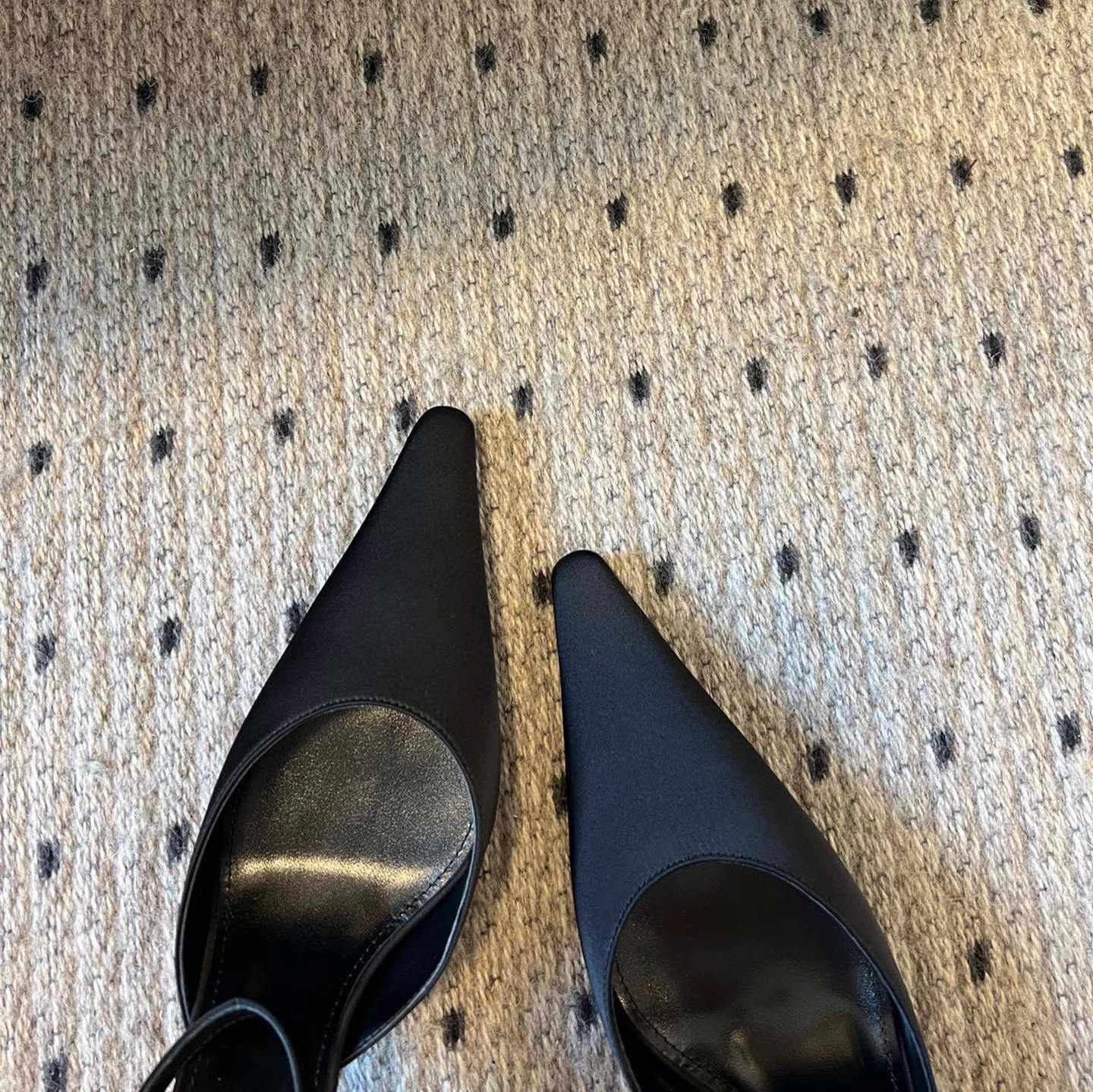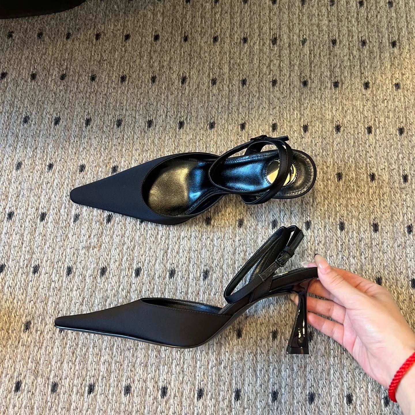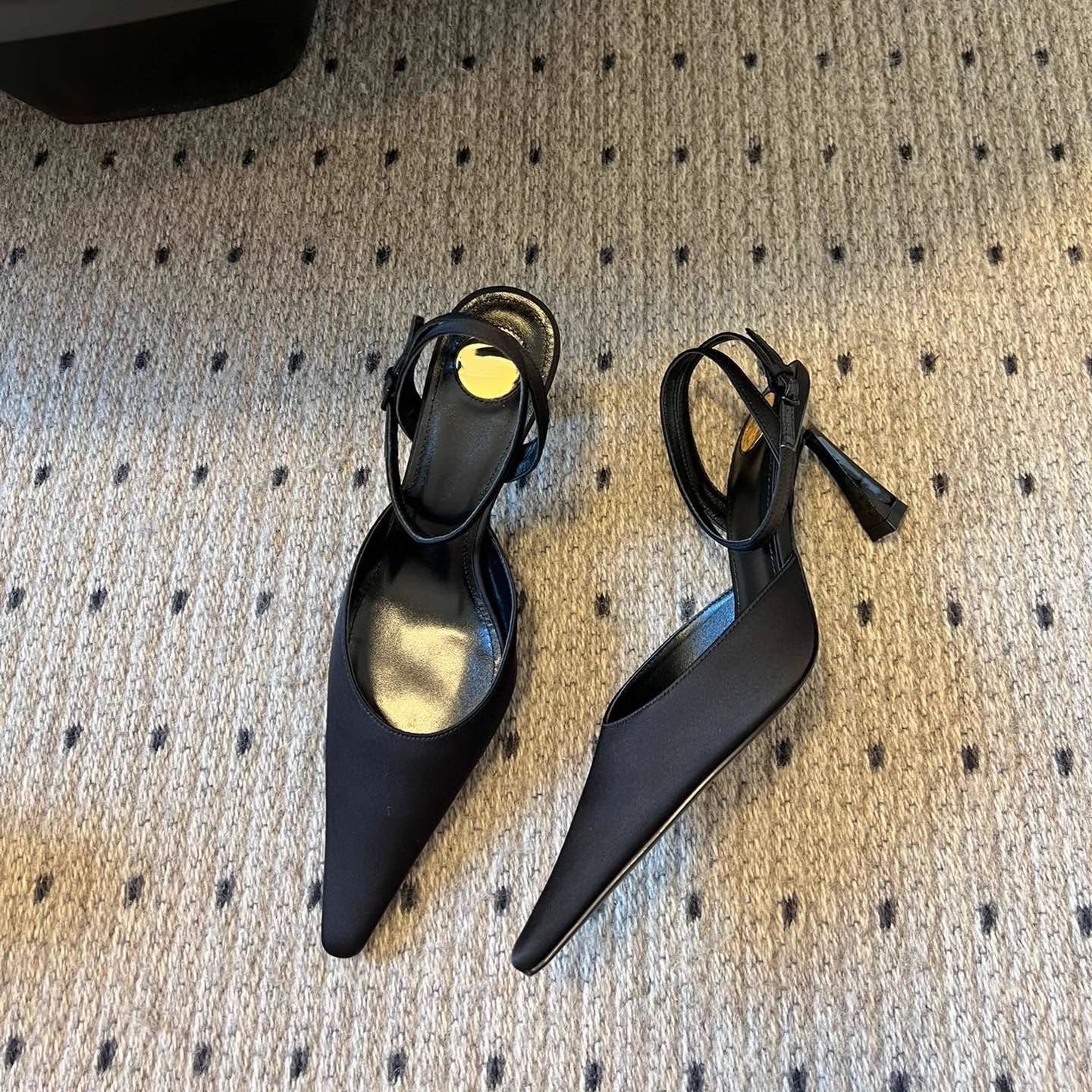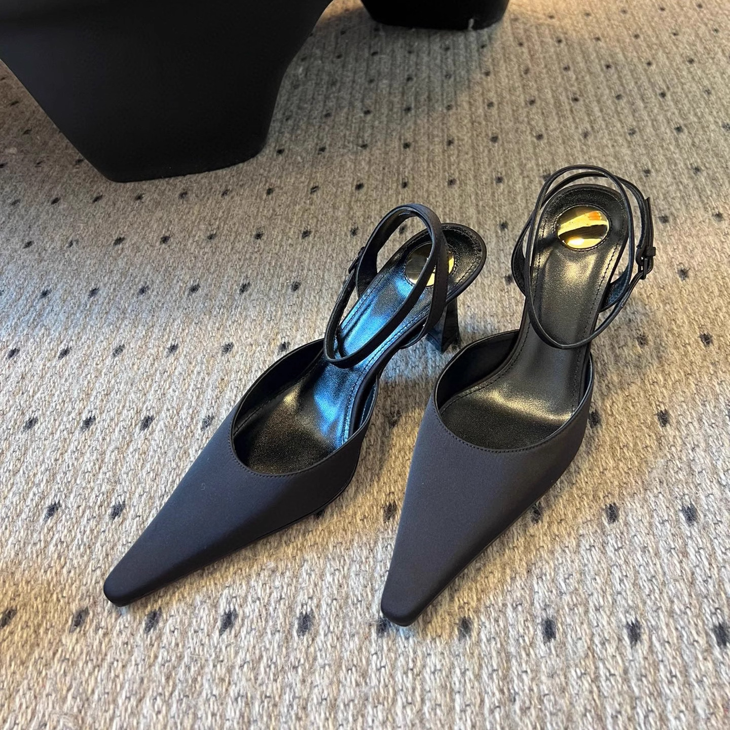 • 블랙 실크 하이힐 포인티드 토 샌들, 굽 높이 약 7.5cm