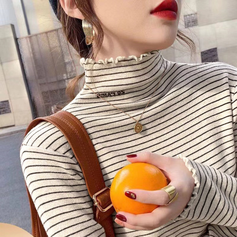 여성용 한국식 슬림 핏 자수 두꺼운 새 긴팔 티셔츠 하프 하이 칼라 탑