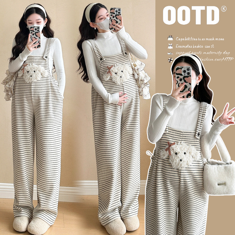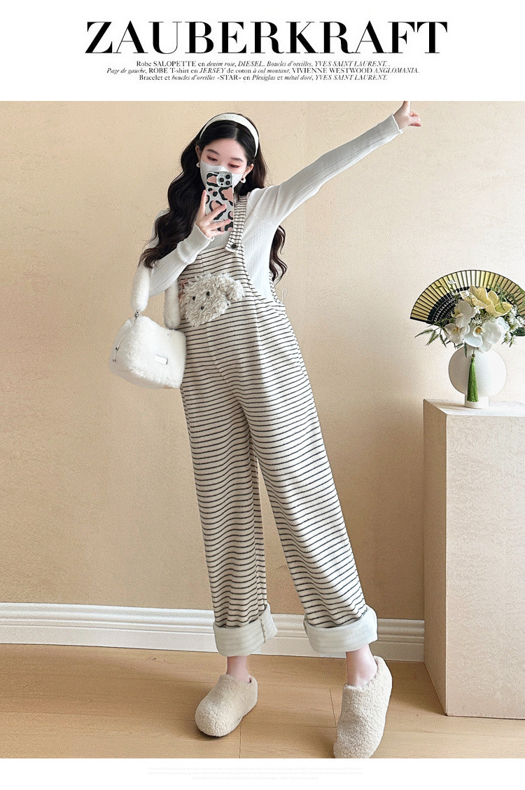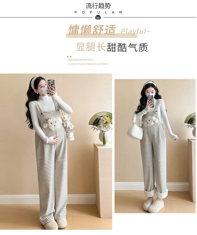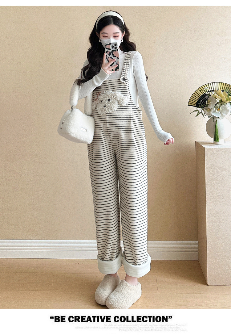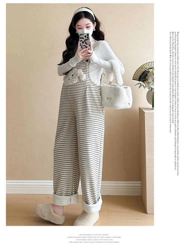 임산부 의류 멜빵 가을과 겨울 새 기모 두꺼운 줄무늬 플러스 사이즈 임산부 바지 맨 위 달콤한 세트