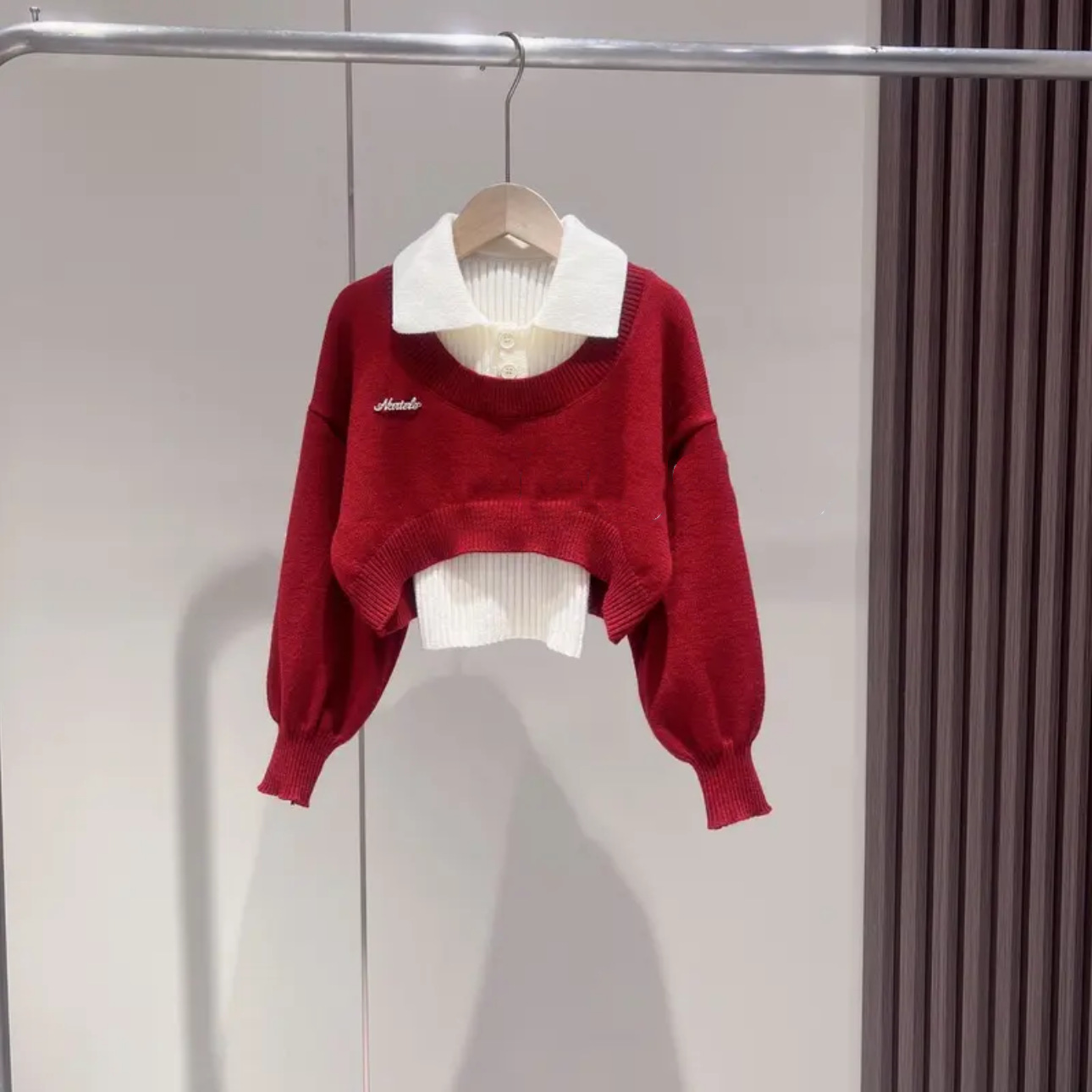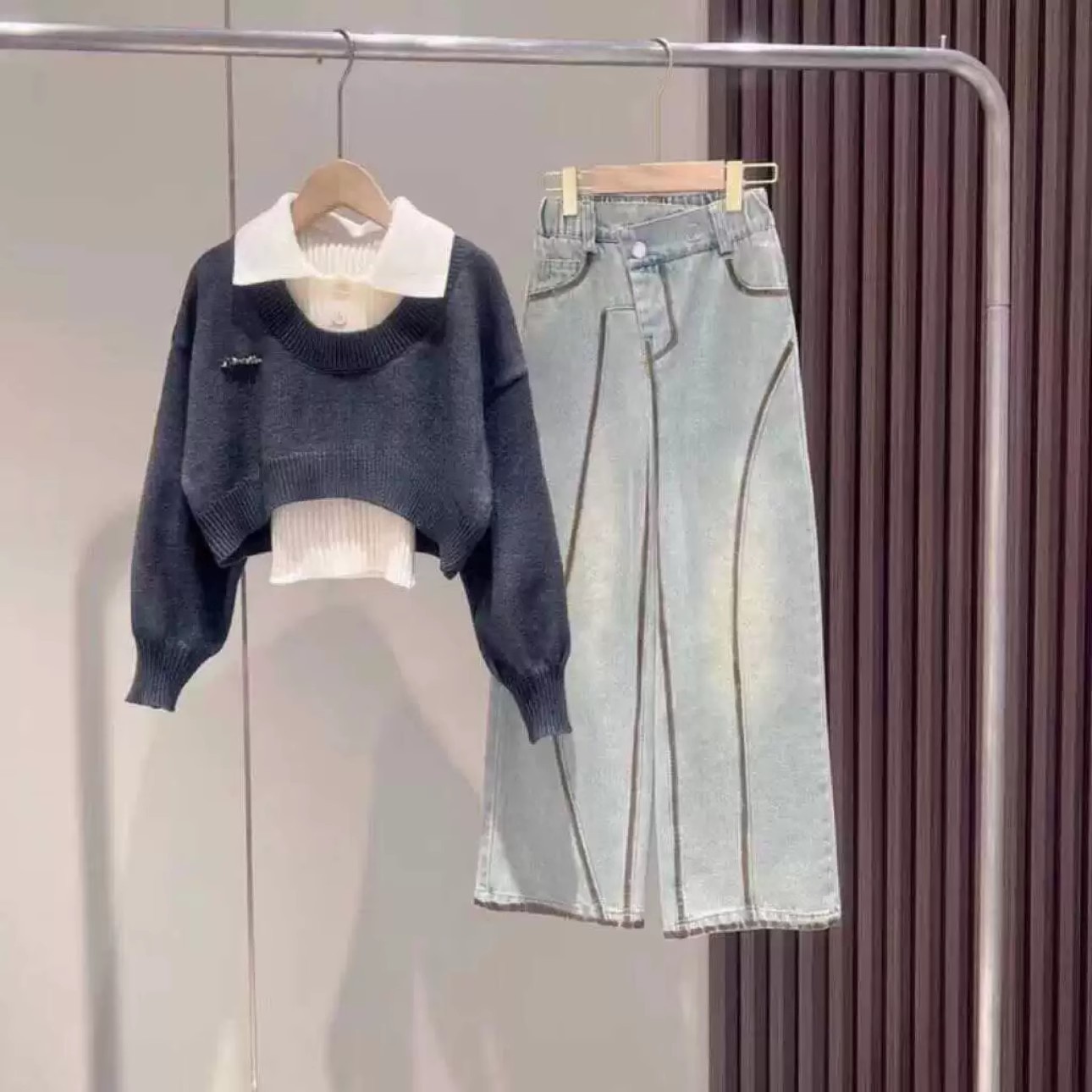 2024 가을과 겨울 소녀 POLO 칼라 짧은 앙고라 레드 스웨터 디자인 개성 데님 넓은 다리 바지 세트 조수
