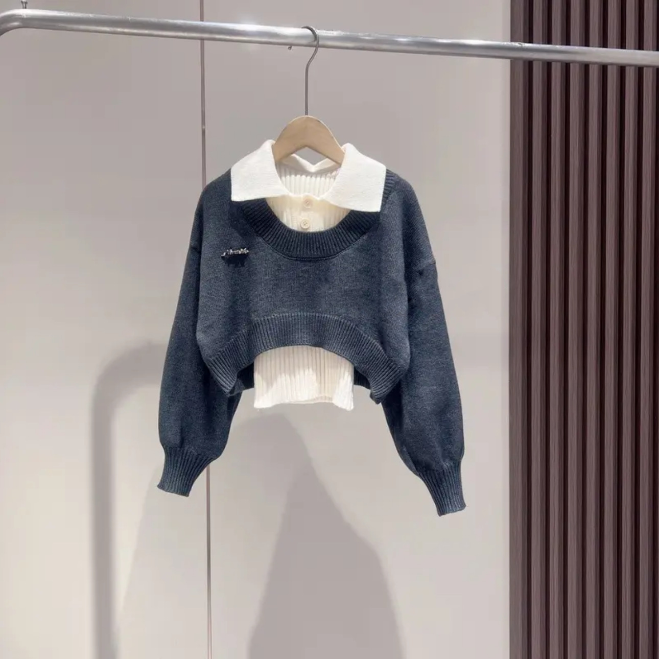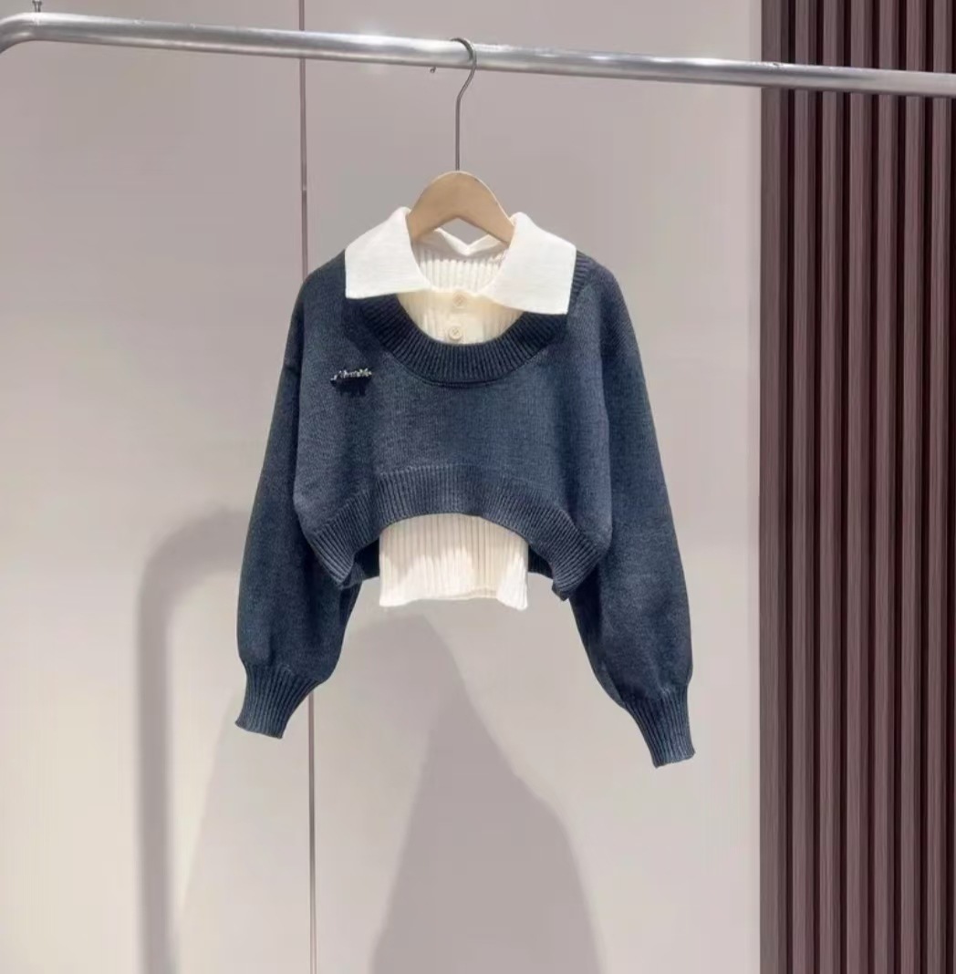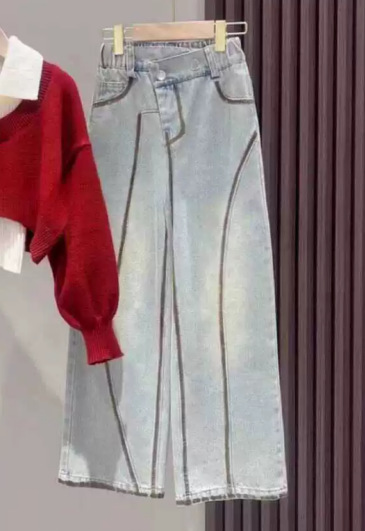 2024 가을과 겨울 소녀 POLO 칼라 짧은 앙고라 레드 스웨터 디자인 개성 데님 넓은 다리 바지 세트 조수스토어 가기