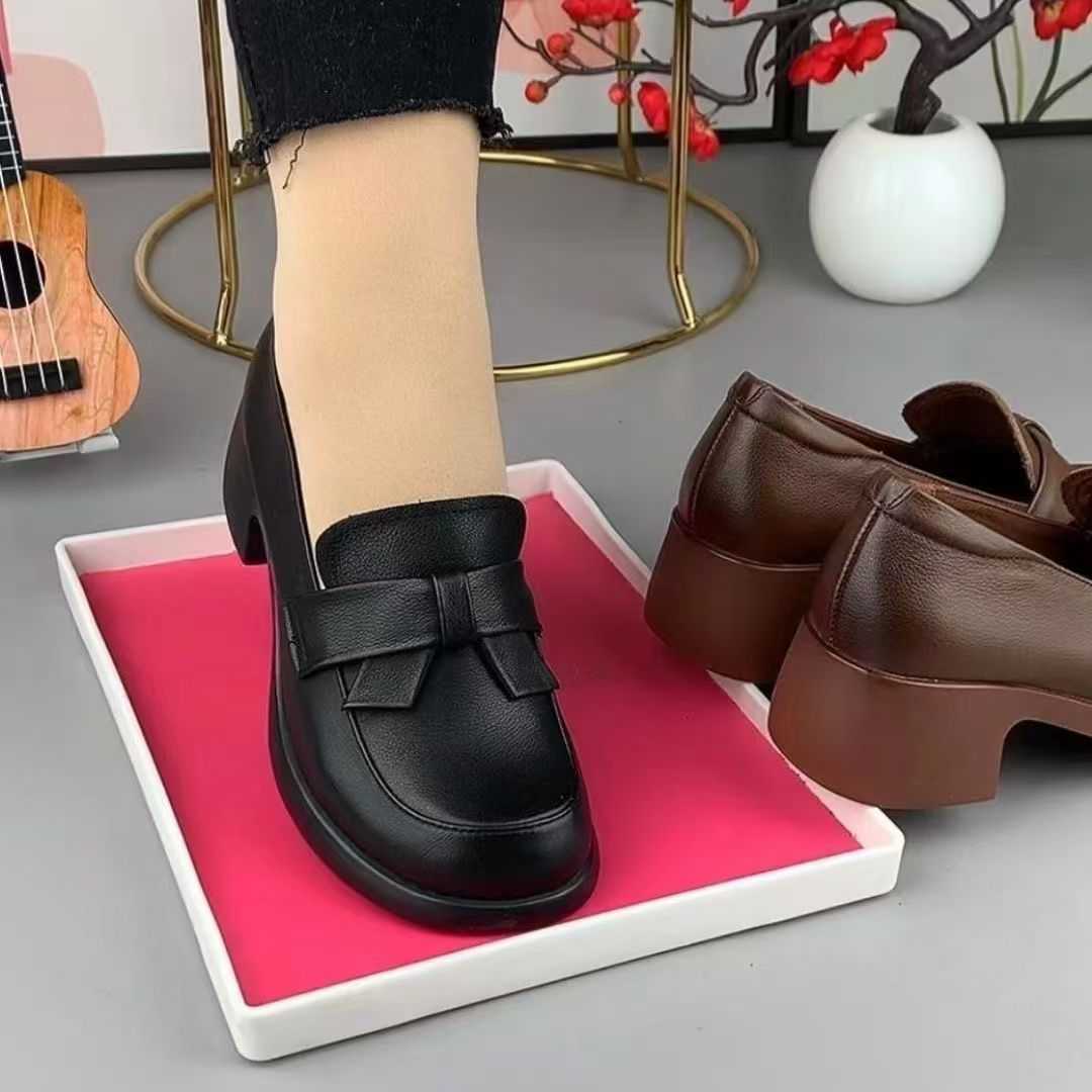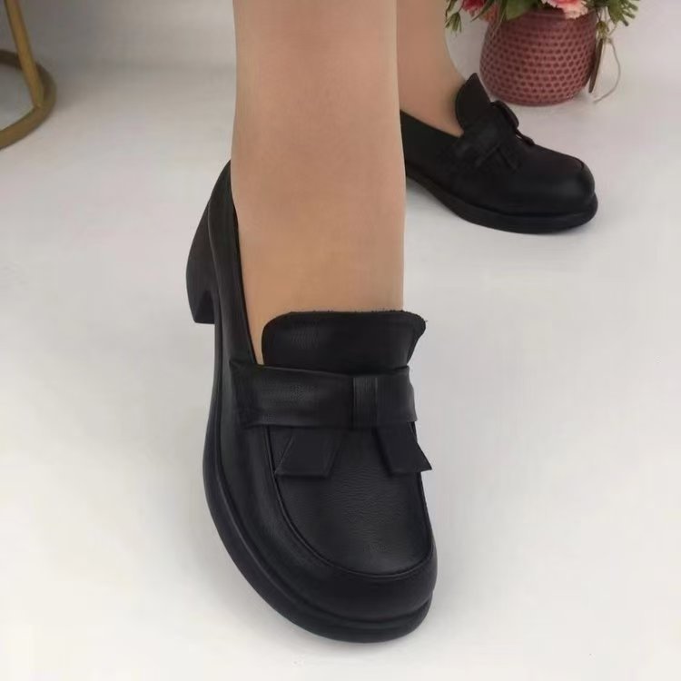 청키 힐 얕은 입 어머니 신발 부드러운 가죽 활 로퍼 여성 신발 흔들 신발 2024 봄과 가을 대외 무역 도매 싱글 신발