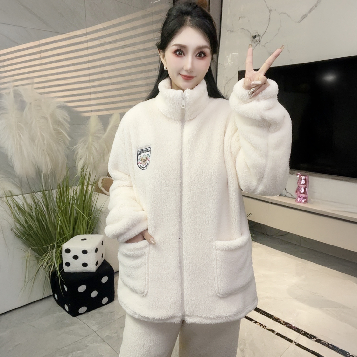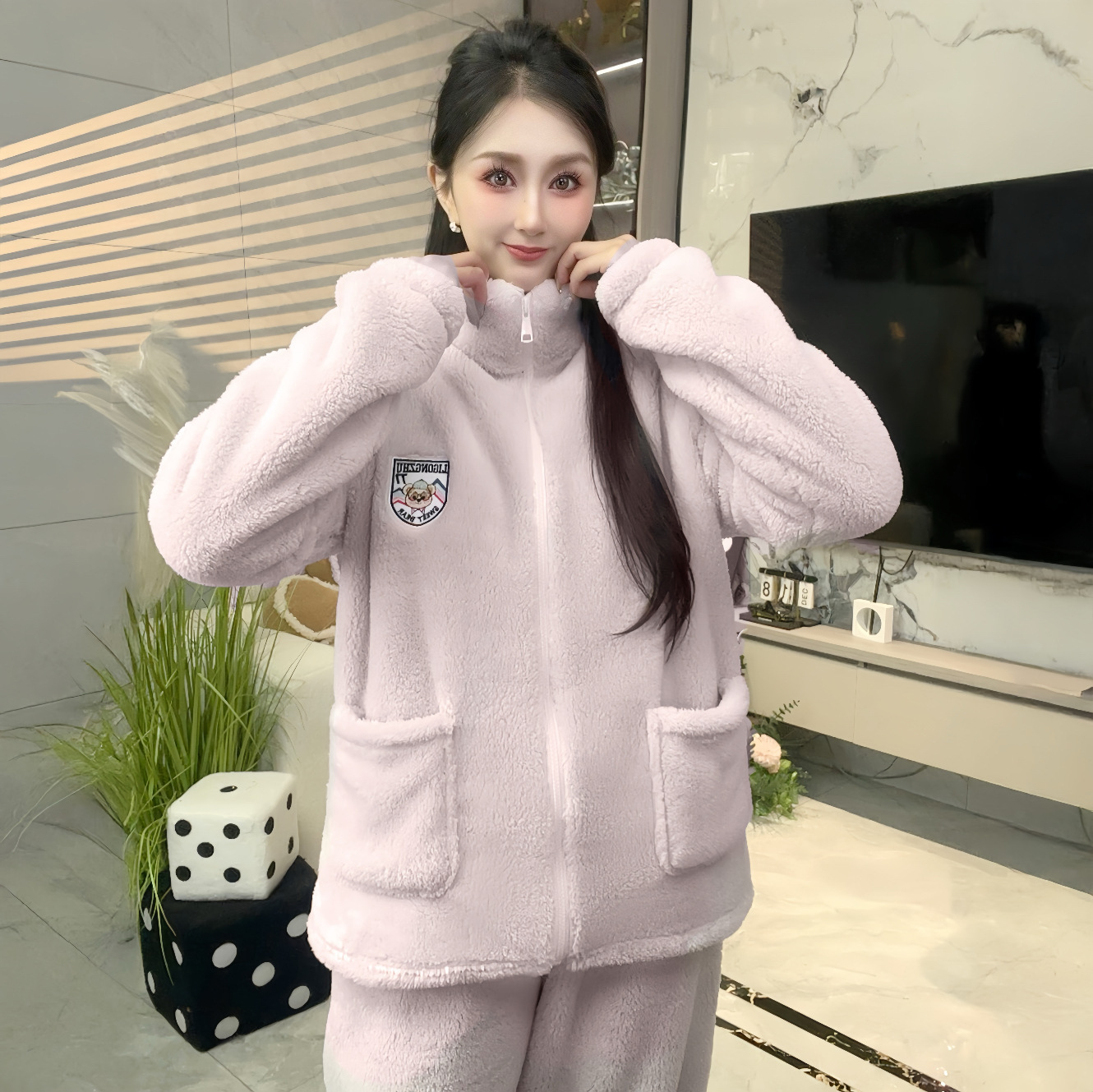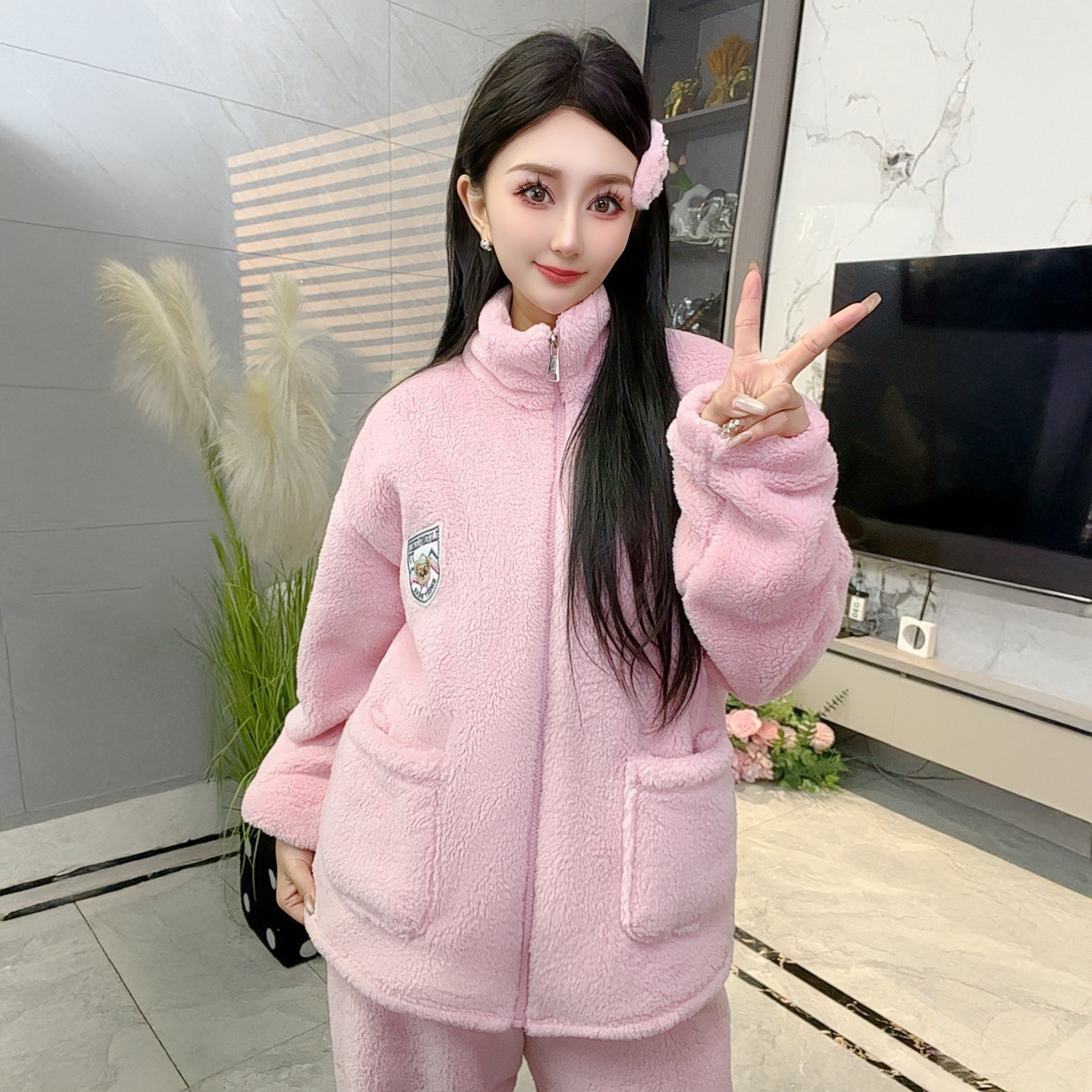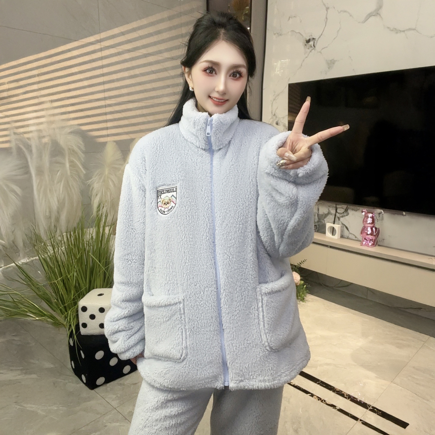 폭발성 기모 두꺼운 여성용 파자마 따뜻한 칼라 지퍼 홈 옷 세트 산호 양털 편안하고 부드러운스토어 가기