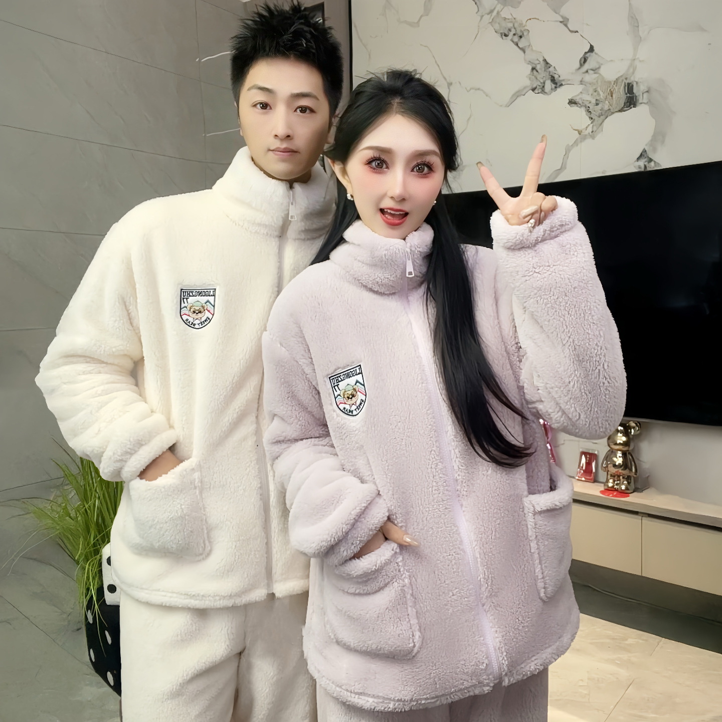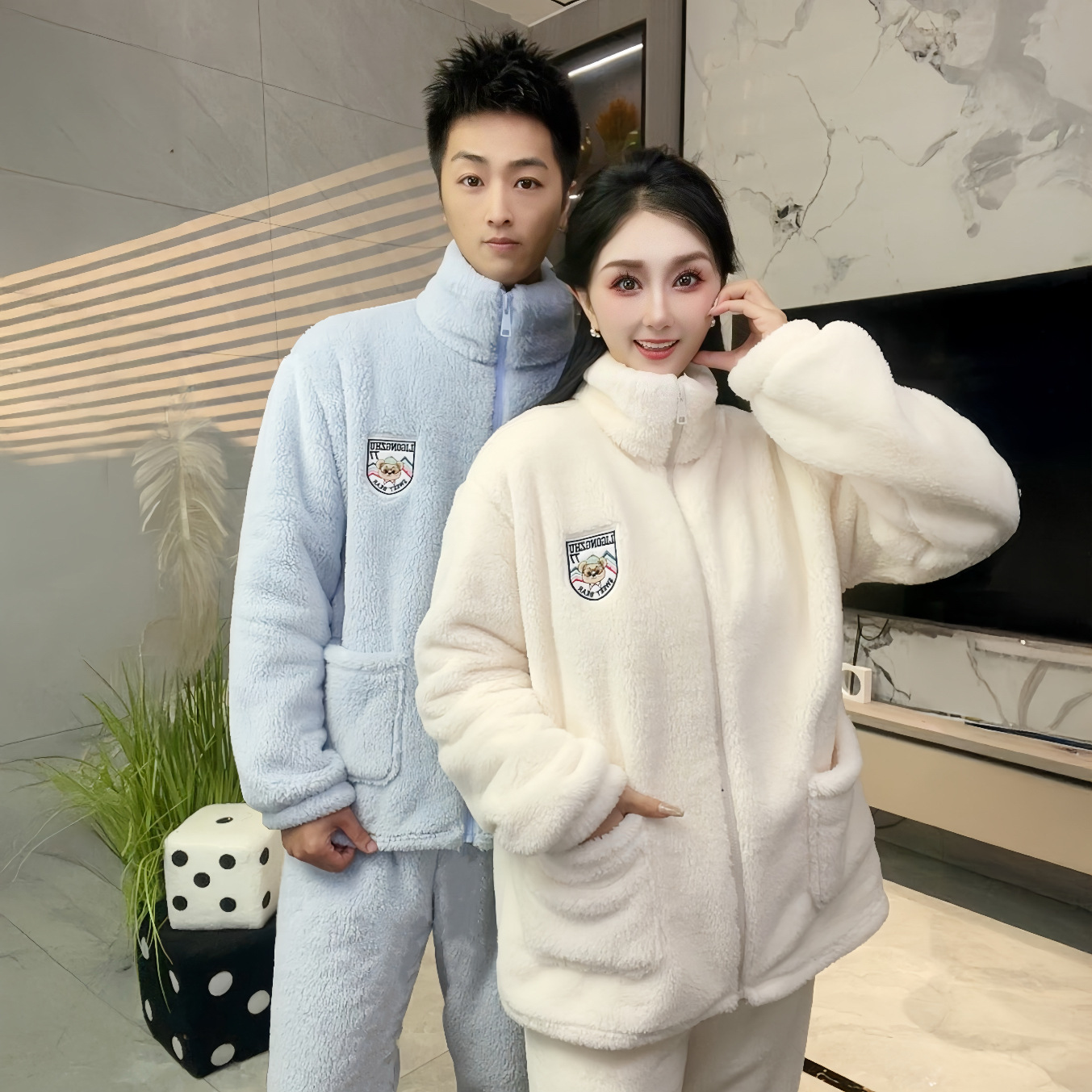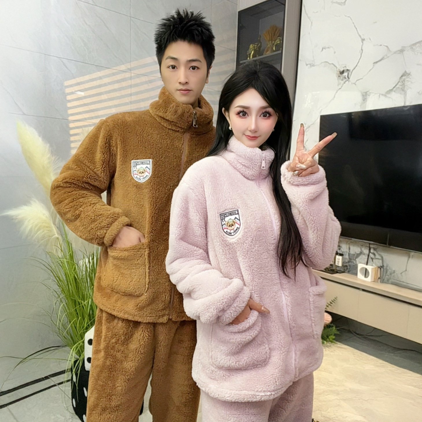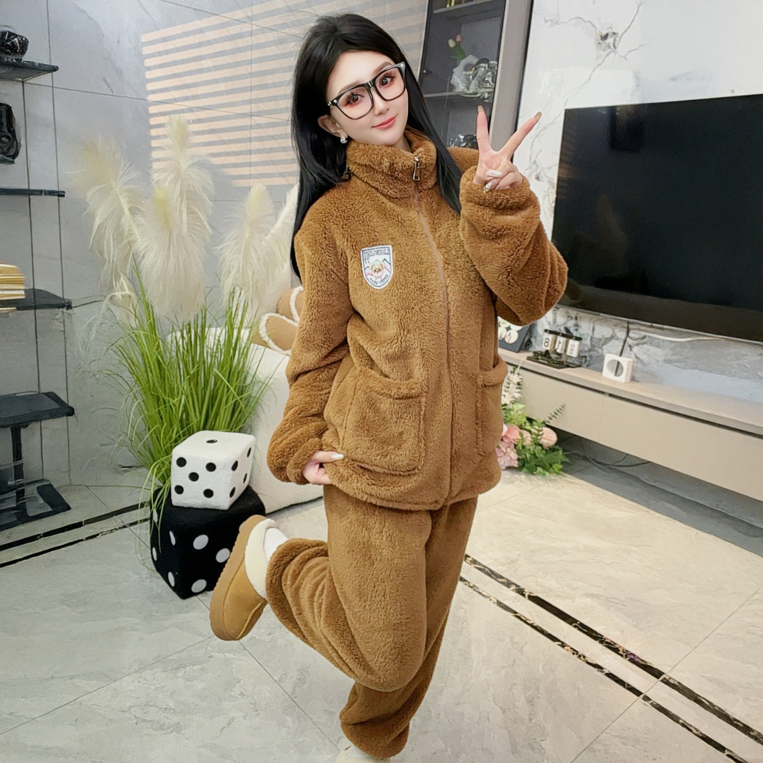 폭발성 기모 두꺼운 여성용 파자마 따뜻한 칼라 지퍼 홈 옷 세트 산호 양털 편안하고 부드러운스토어 가기