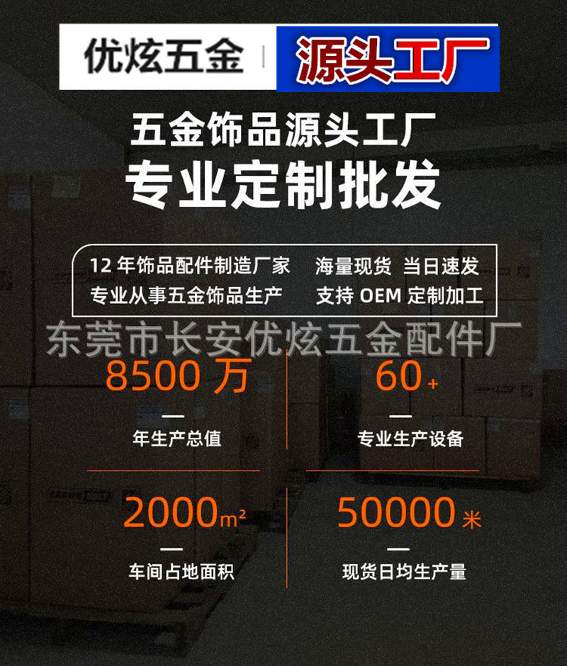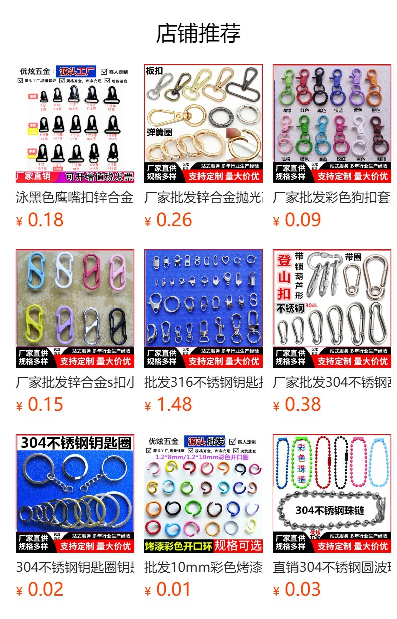 东莞市长安优炫五金饰品配件厂是专业生产:304不锈钢钥匙圈,弹簧圈,铃铛,登山扣,门扣,开口圈,s扣,鹰嘴扣,刀扣,不锈钢珠链、手机绳,手机吊绳、钥匙扣,钥匙链、龙虾扣,铃铛、别针,扣针、活动扣,卡圈、链条,饰品链、钢丝绳扣,D扣、圆圈,鸡眼、撞钉,狗扣、开口圈,9字针、T字针,回形针、锁匙圈,螺丝扣、朱胆扣,G字扣、鸡亦扣等五金饰品配件等产品专业生产加工的公司,拥有完整、科学的质量管理体系。东莞市长安优炫五金饰品配件厂的诚信、实力和产品质量获得业界的认可。欢迎各界朋友莅临参观、指导和业务洽谈。可以开13%增值税发票。。