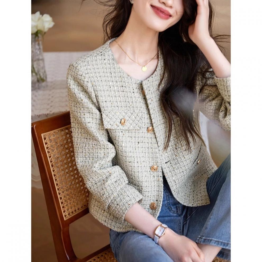 샤넬 스타일 코트 여성의 봄과 가을 새로운 탑 복고풍 고급 디자인 센스 그린 슬림 우아한 사교계 짧은 코트
