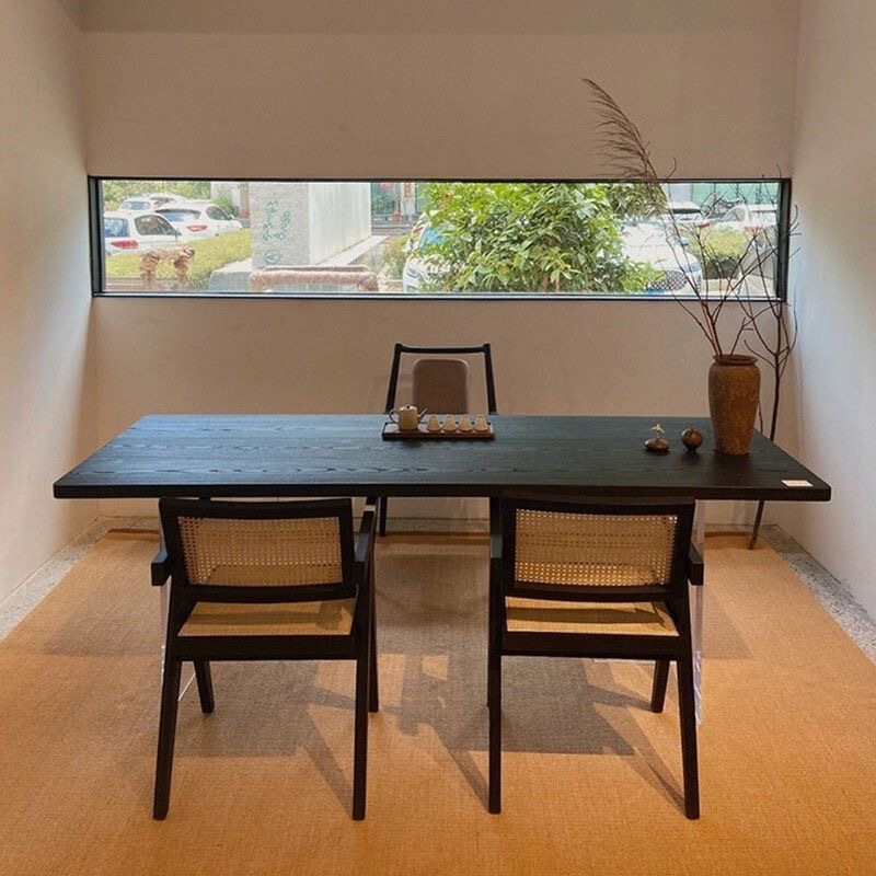 조용한 스타일 탄산 블랙 솔리드 우드 식탁 로그 대형 보드 작업대 매우 간단한 스타일 아크릴 서스펜션 오피스 티 테이블스토어 가기