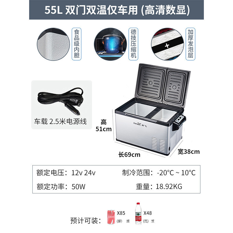 • 55L 순수 자동차 (이중 도어 이중 온도 + 냉동 및 냉장 파티션 + 충격 방지 및 미끄럼 방지)