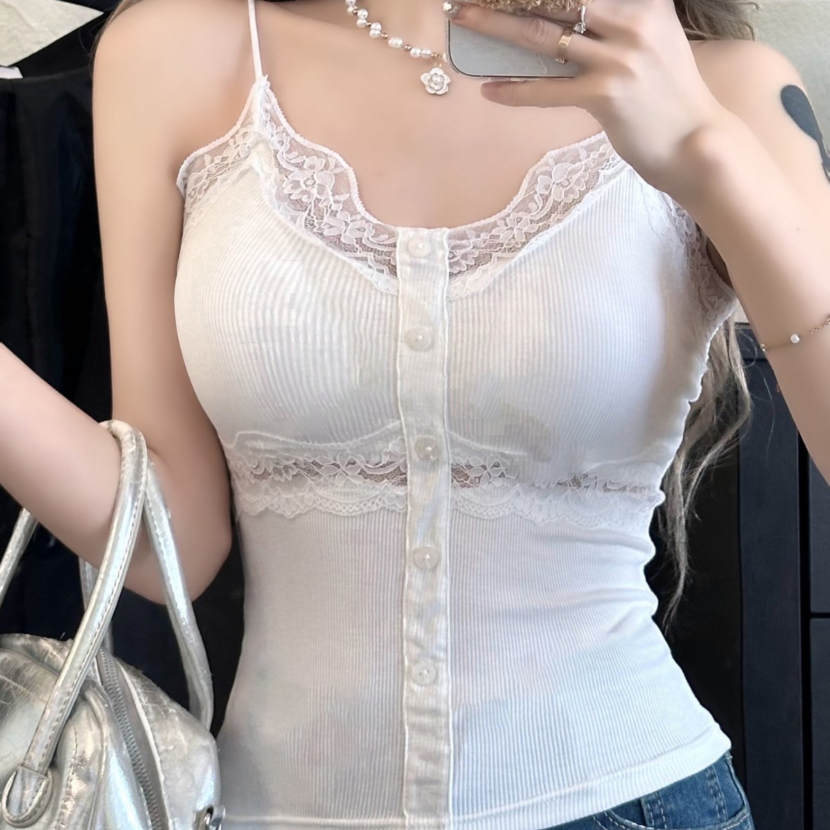 2252 # 레이스 스티칭 V-Neck 작은 카미 솔 조끼 여성의 새로운 순수 섹시한 슬림 핏 슬리밍 내베이스 탑스토어 가기
