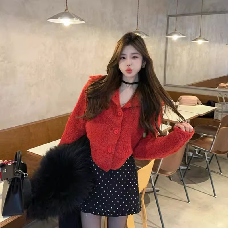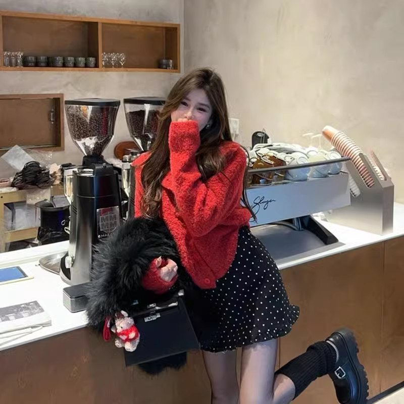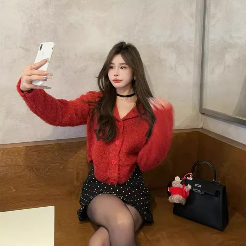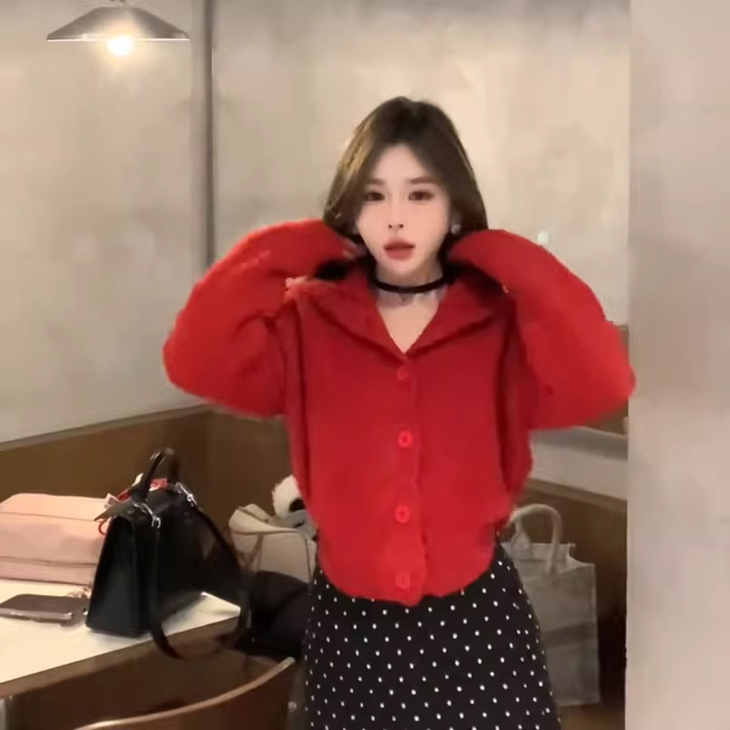 새해의 붉은 분위기 높은 목 루프 벨벳 스웨터 코트 여성의 겨울 두꺼운 니트 카디건 루즈 쇼트 탑스토어 가기