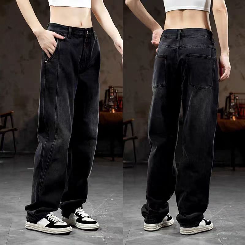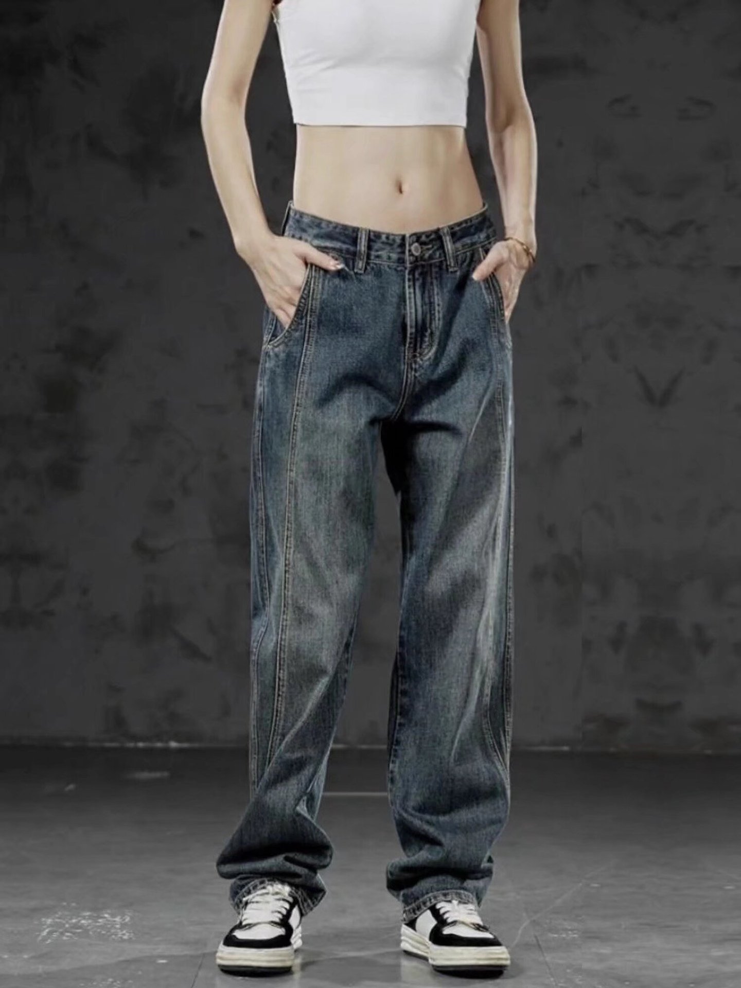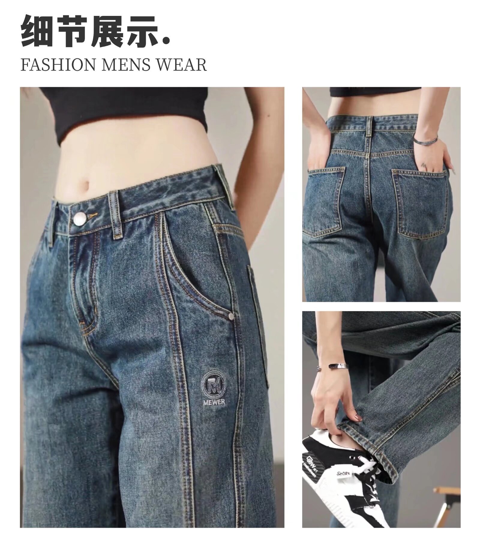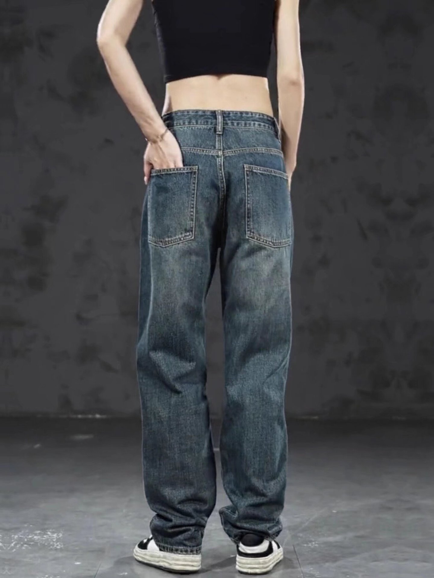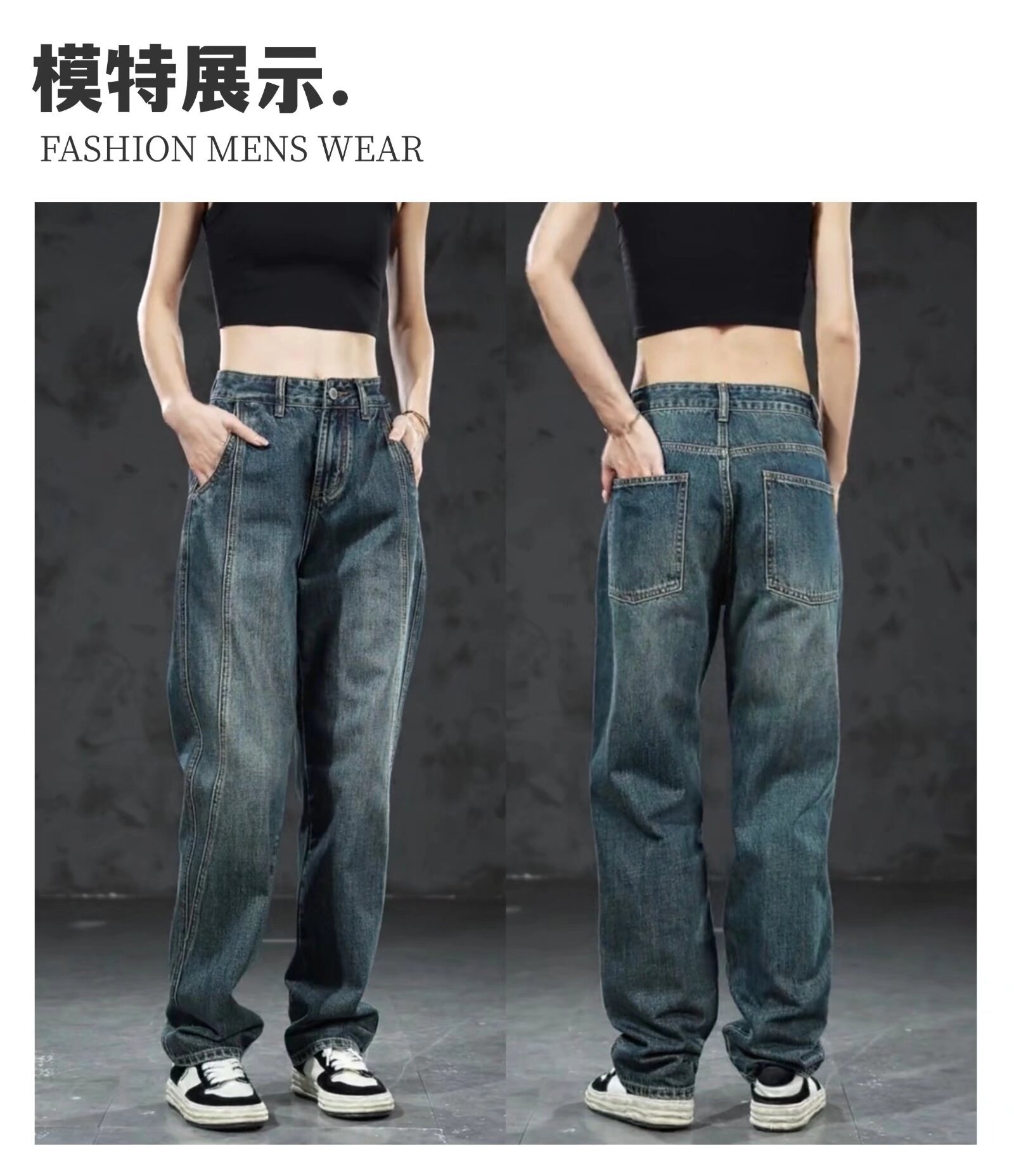 봄과 가을 새로운 미국 스타일 레트로 오래 씻은 넓은 다리 청바지 남자 느슨한 올매치 할란 스트레이트 캐주얼 바지스토어 가기
