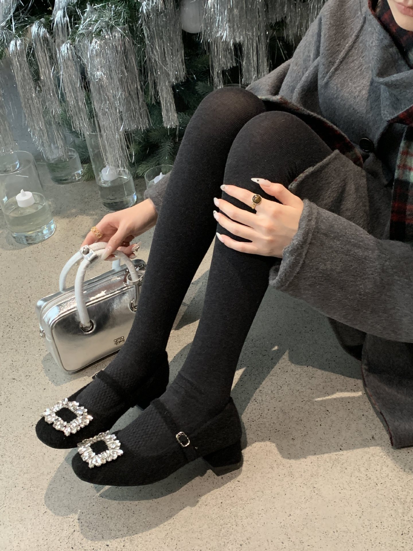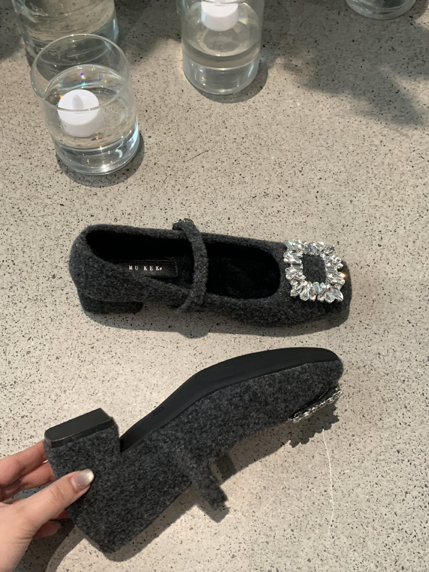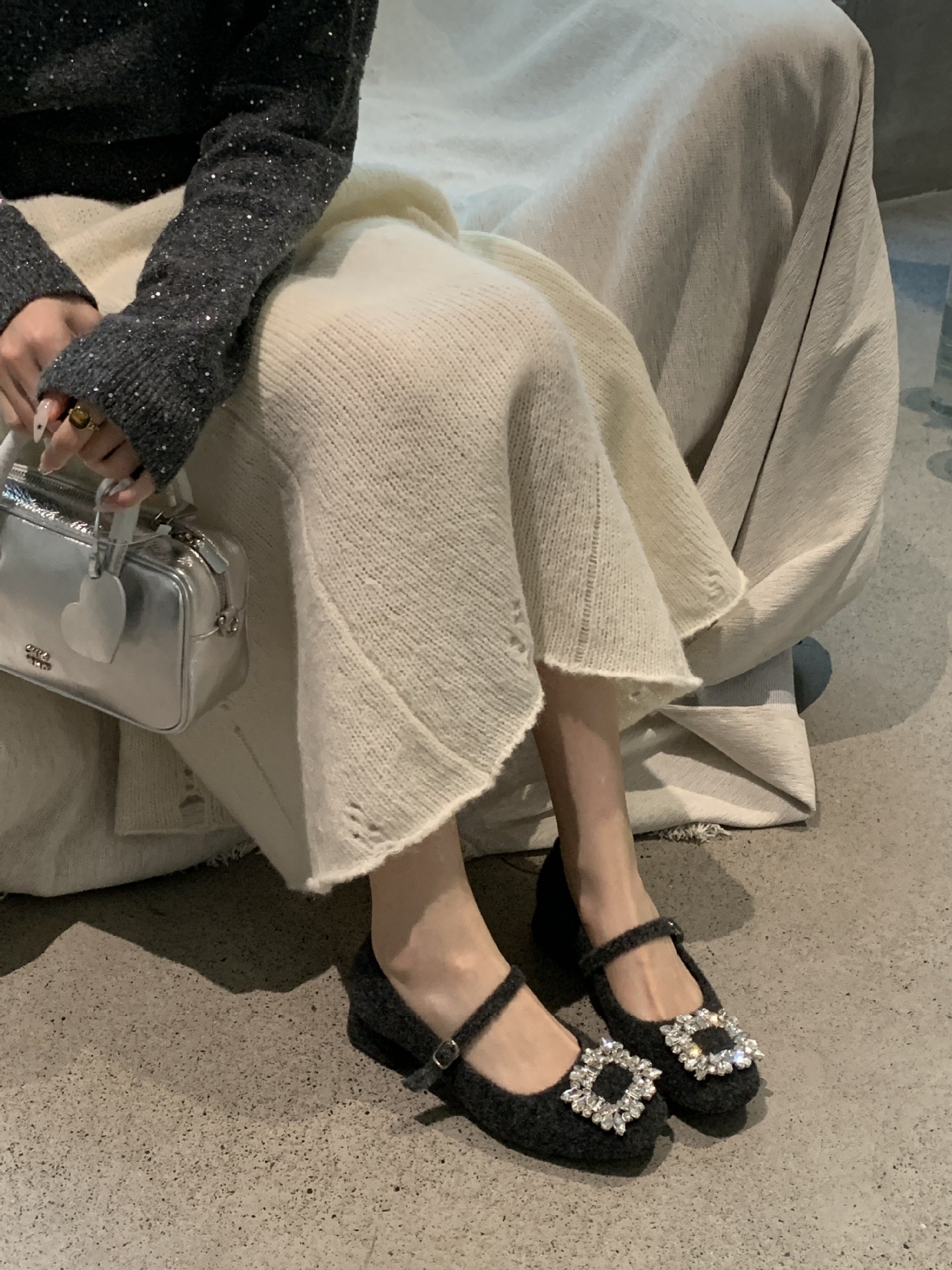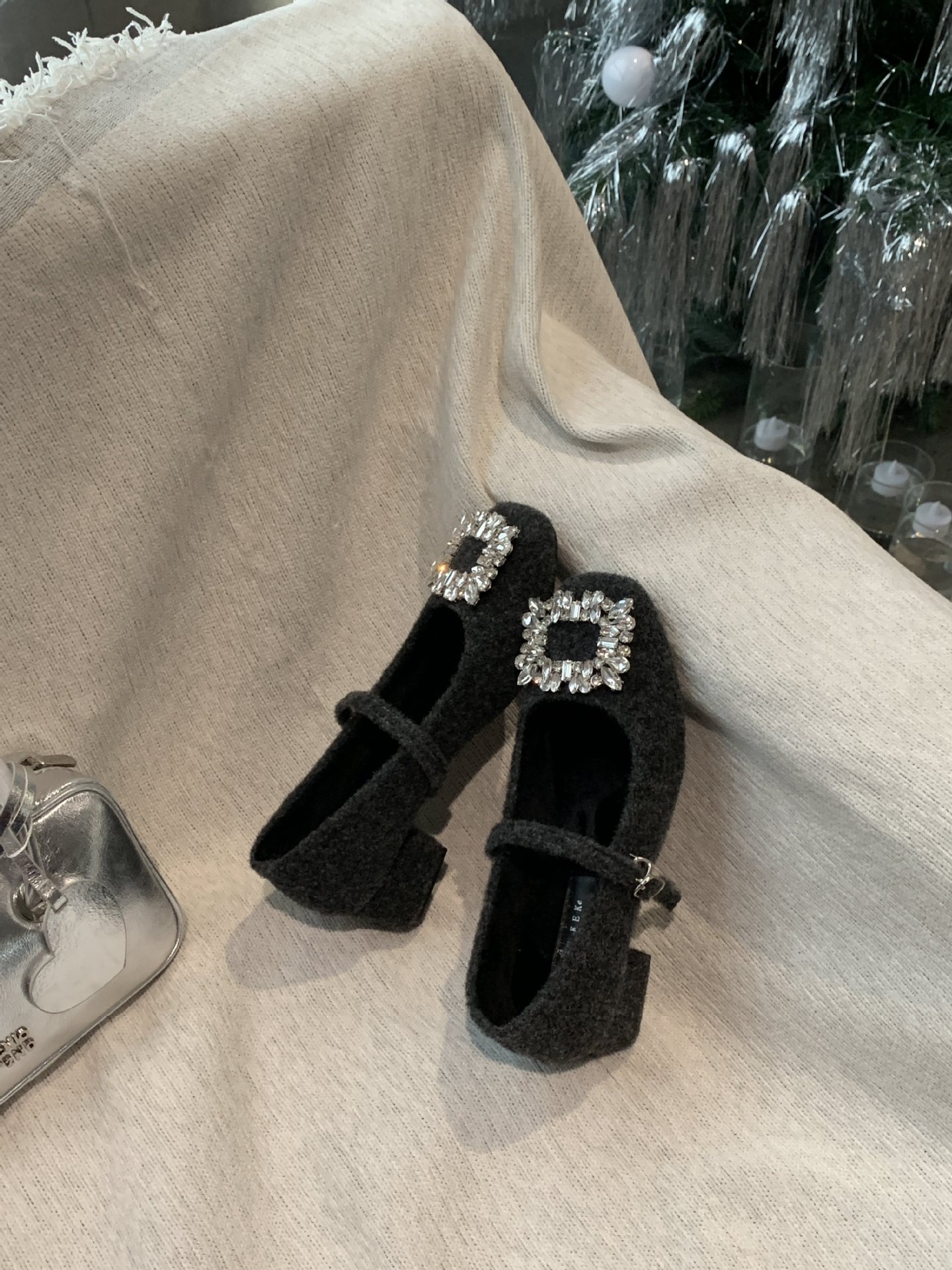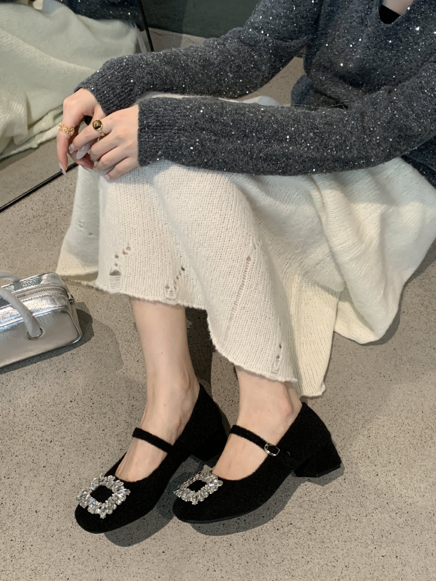 굵은 뒤꿈치 우아한 메리 제인 신발 프렌치 이브닝 스퀘어 헤드 라인스톤 모직 신발 여성의 가을 및 겨울 외부 하이힐 신발 착용
