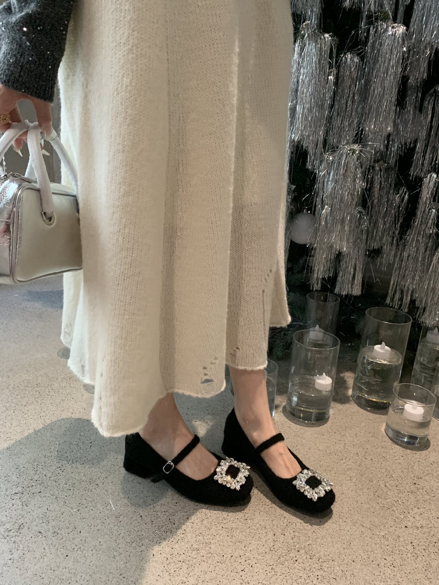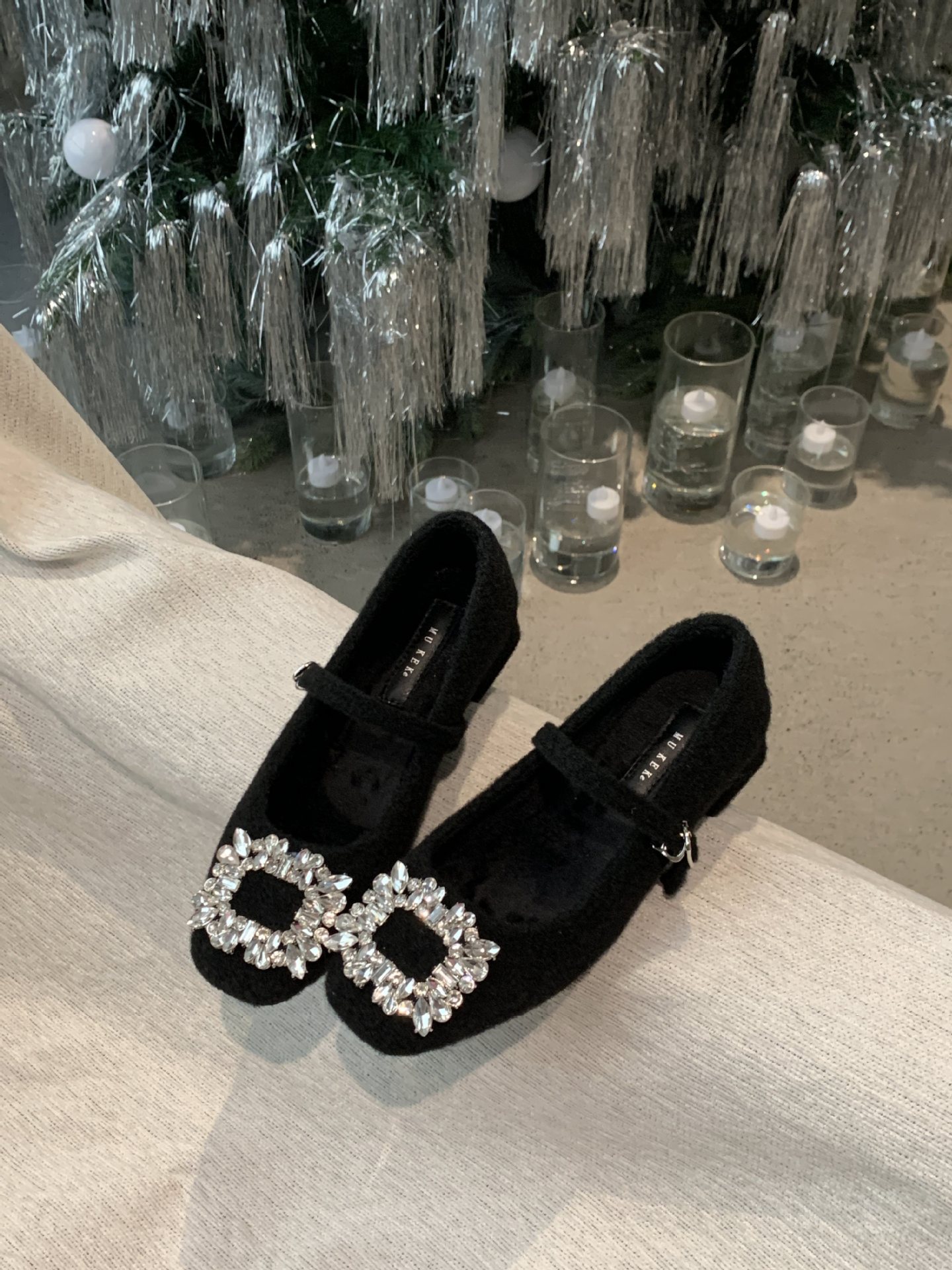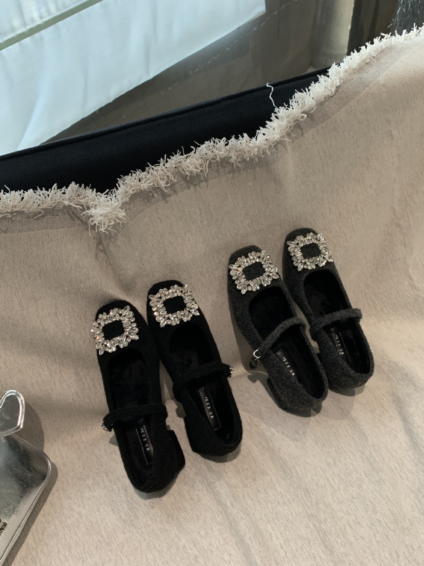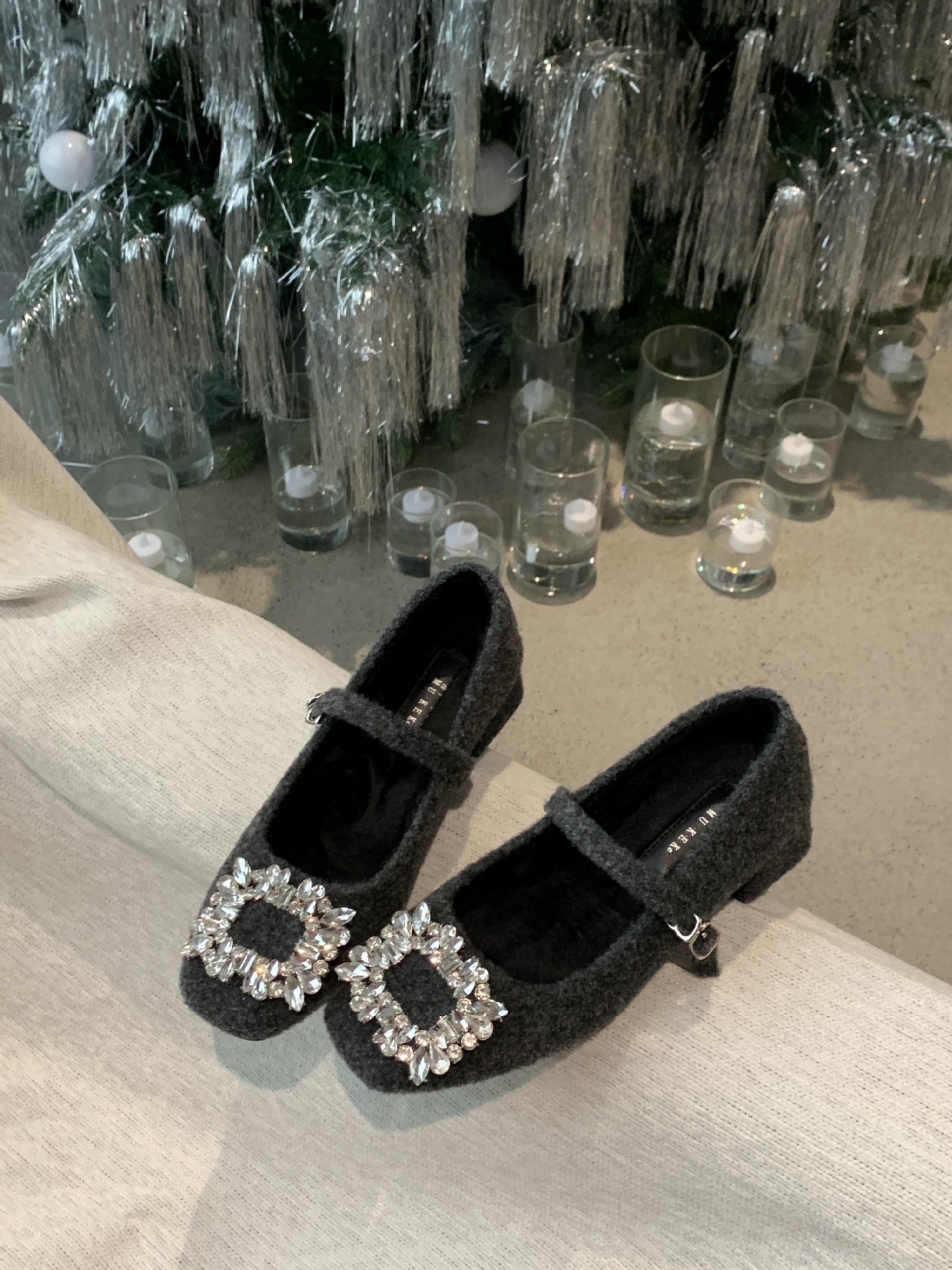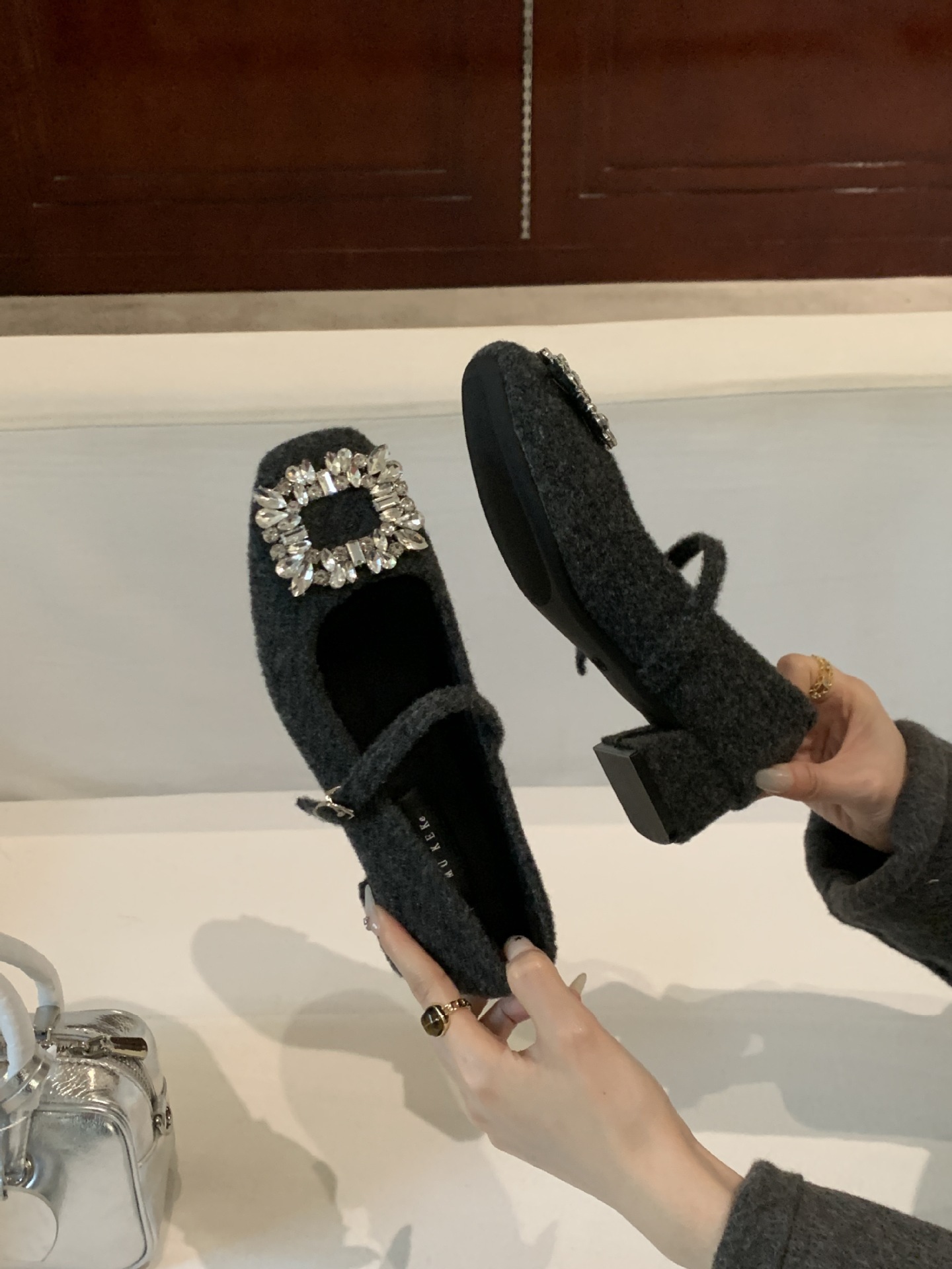굵은 뒤꿈치 우아한 메리 제인 신발 프렌치 이브닝 스퀘어 헤드 라인스톤 모직 신발 여성의 가을 및 겨울 외부 하이힐 신발 착용