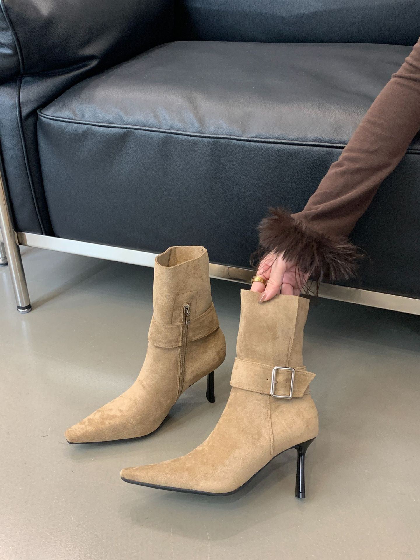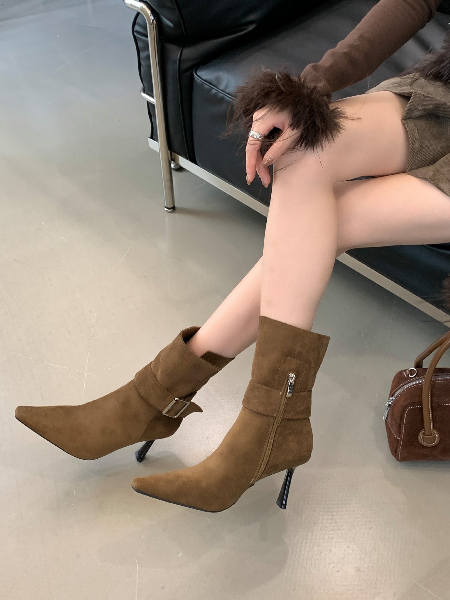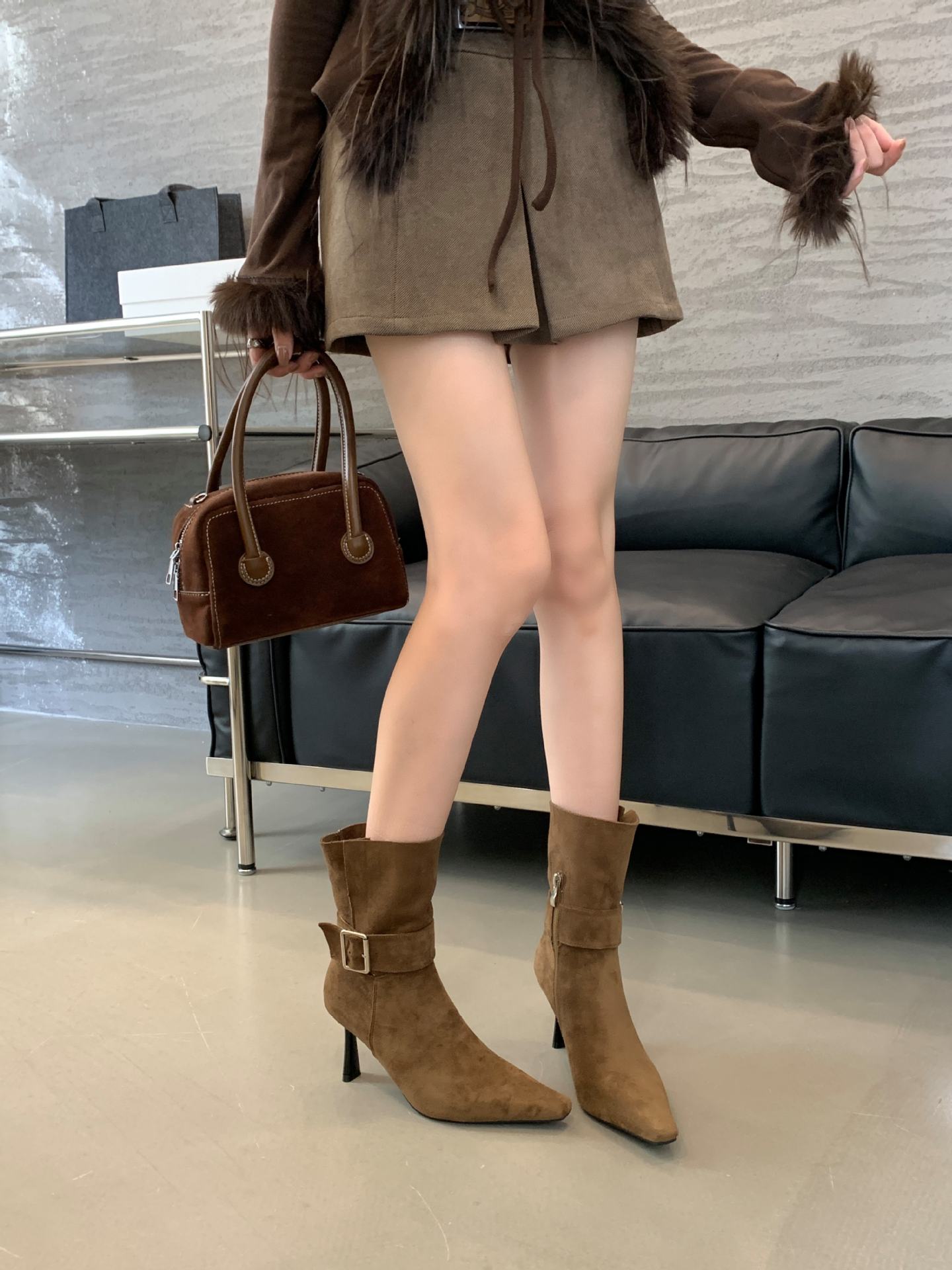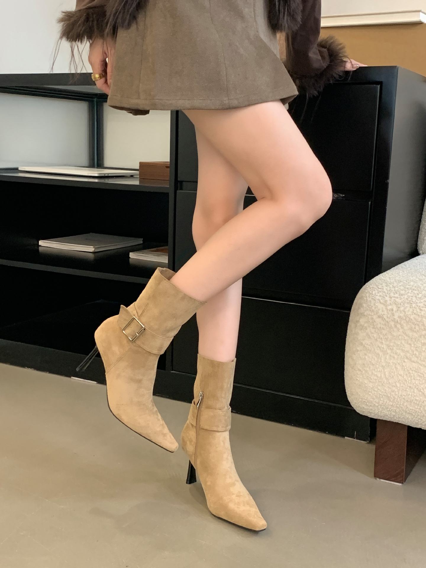 뾰족한 하이힐 카키 힙 부츠 중간 배럴 기사 부츠 여성 신발 2024 새로운 봄 가을 겨울 얇은 부츠스토어 가기
