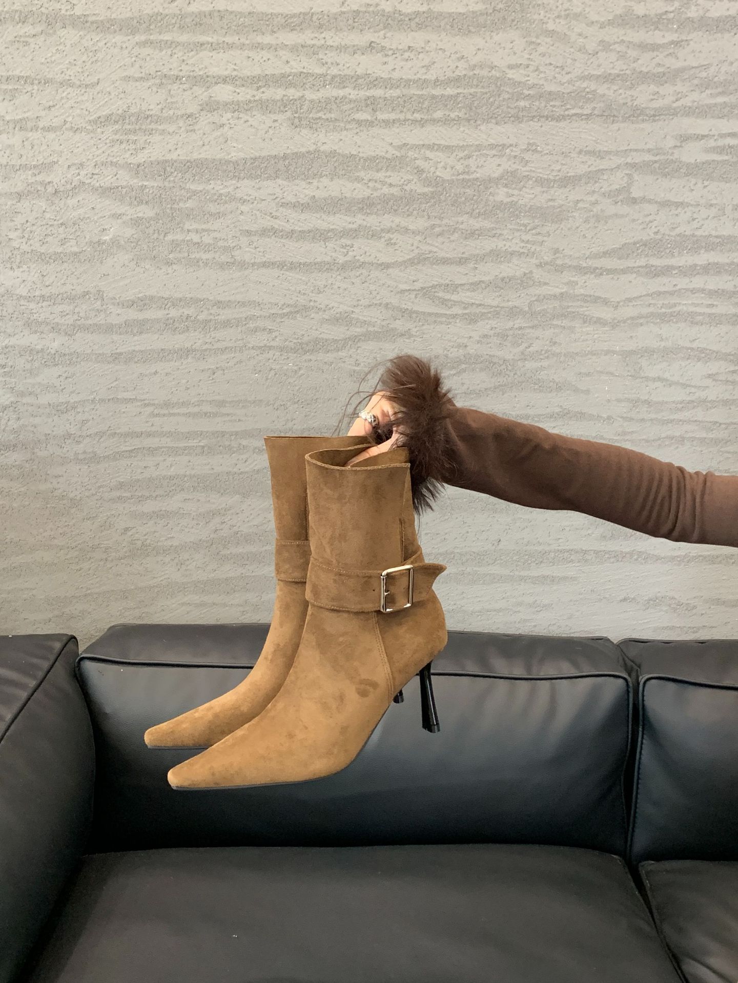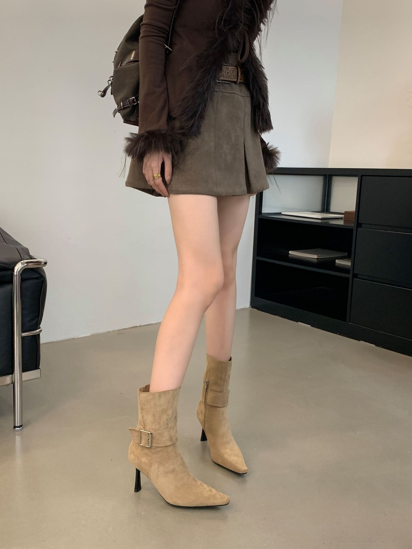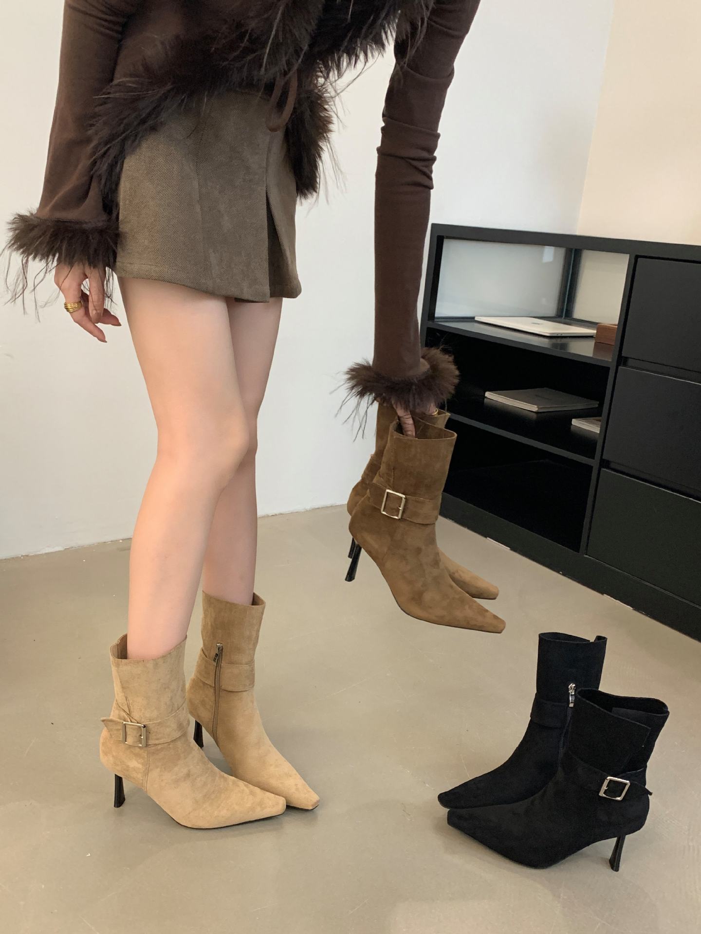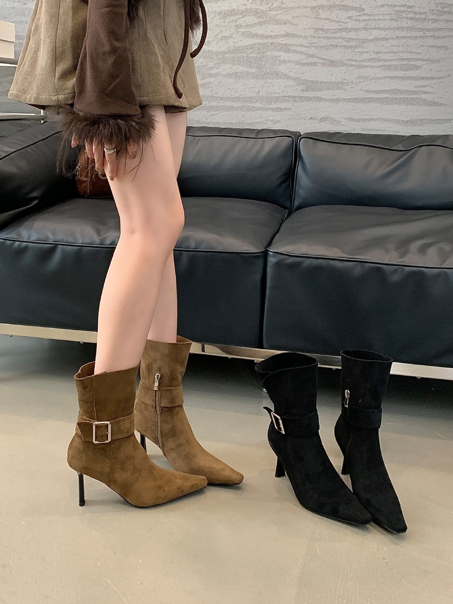 뾰족한 하이힐 카키 힙 부츠 중간 배럴 기사 부츠 여성 신발 2024 새로운 봄 가을 겨울 얇은 부츠스토어 가기