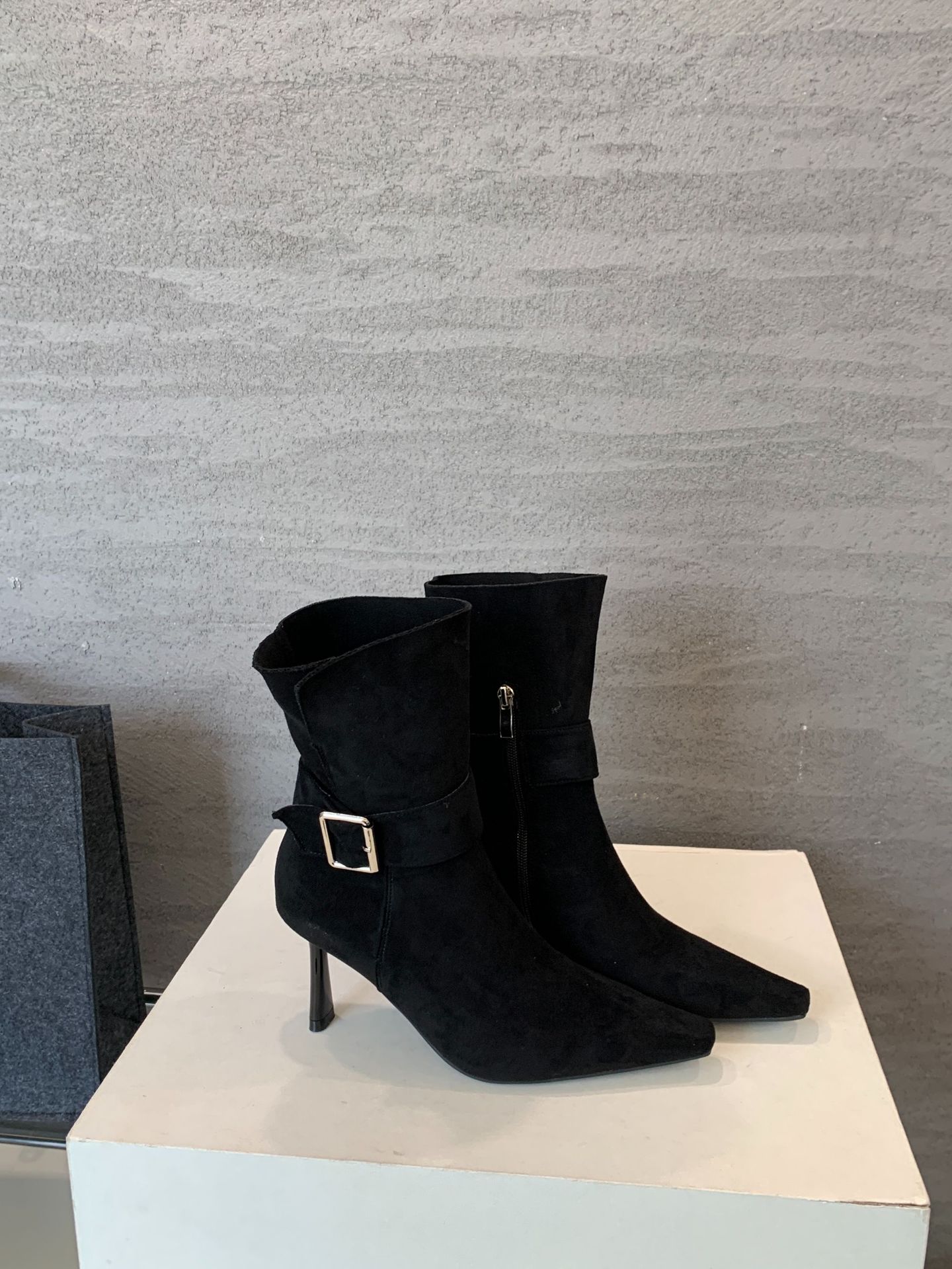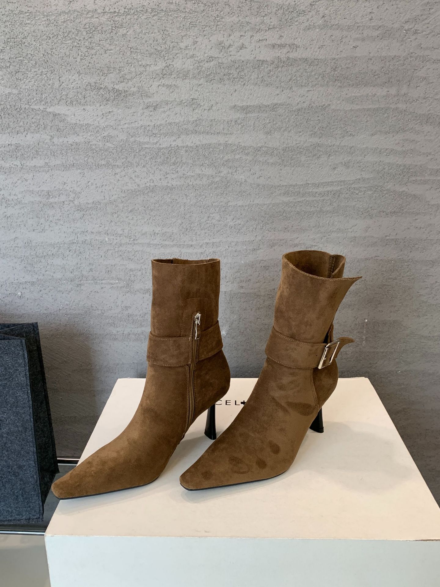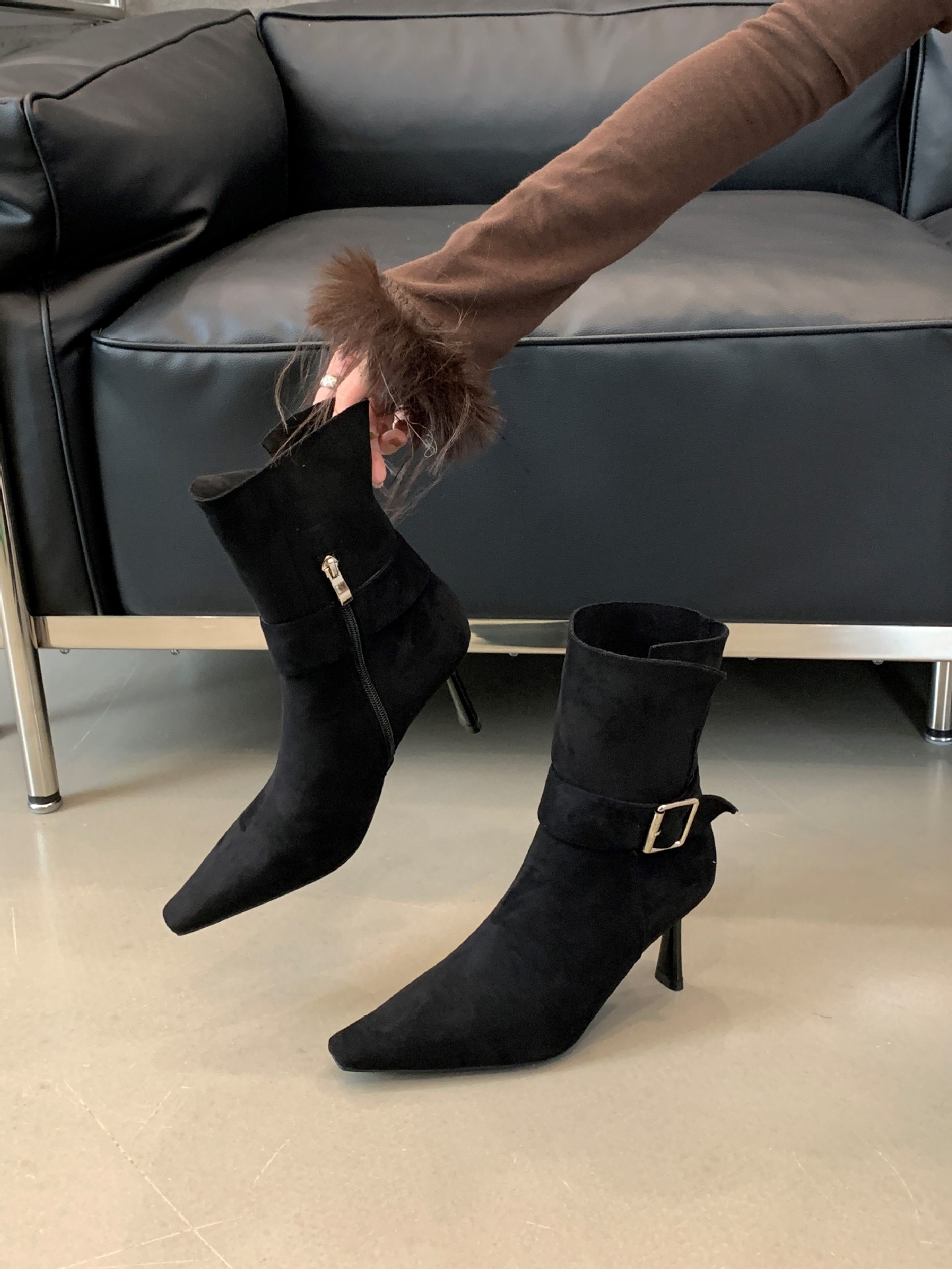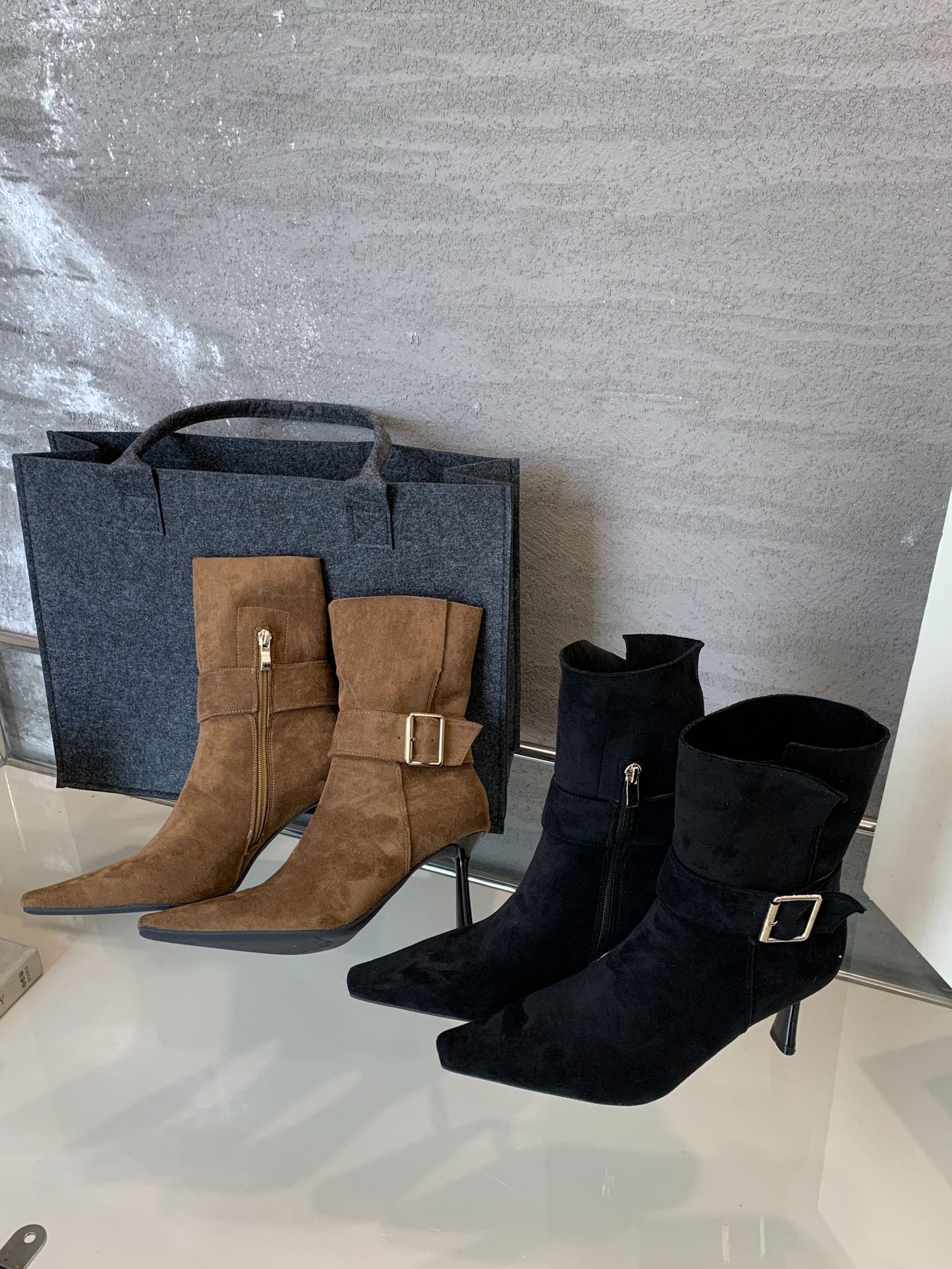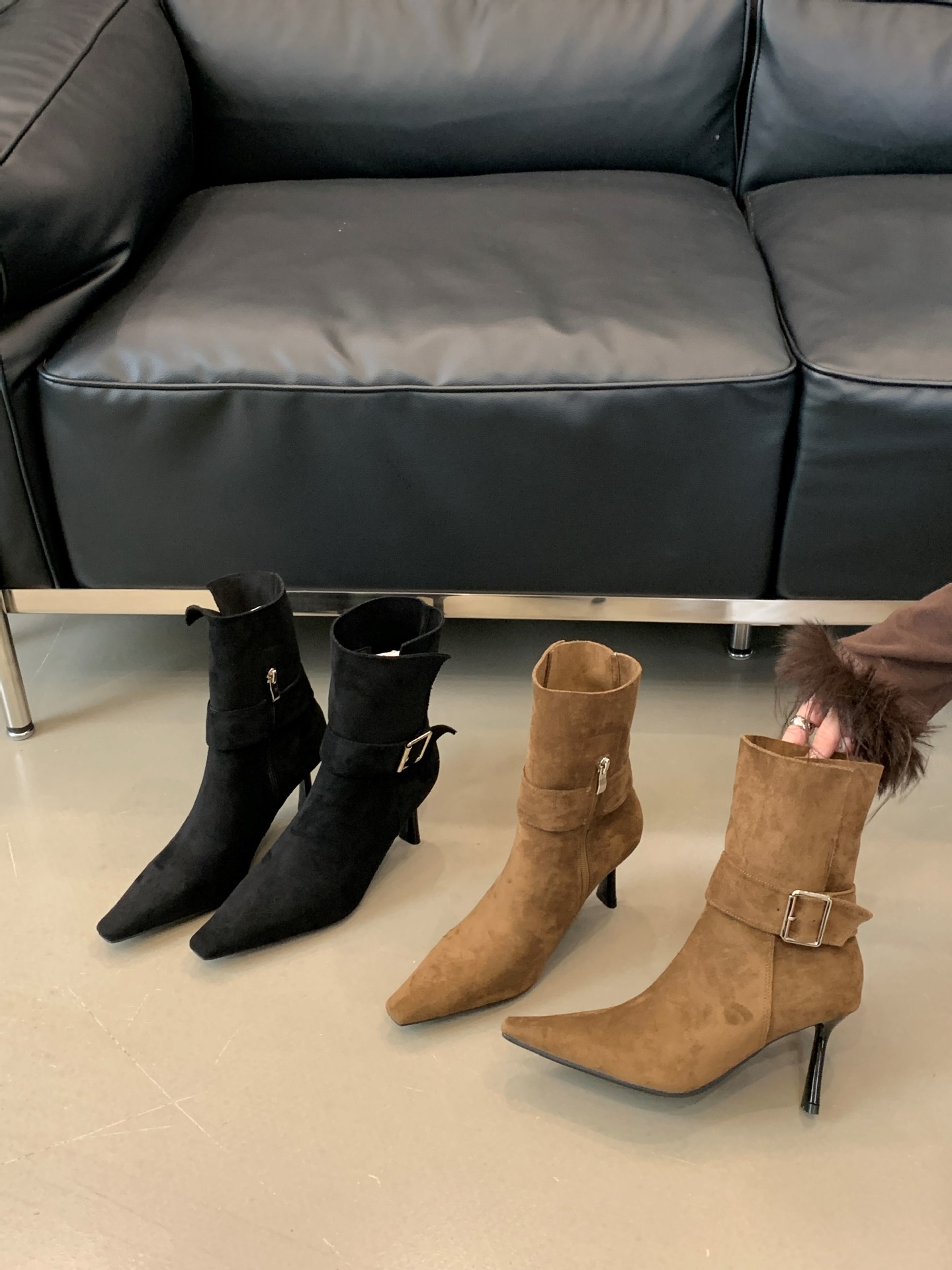 뾰족한 하이힐 카키 힙 부츠 중간 배럴 기사 부츠 여성 신발 2024 새로운 봄 가을 겨울 얇은 부츠스토어 가기