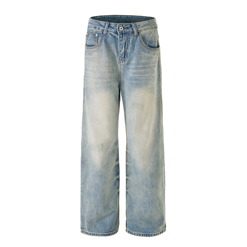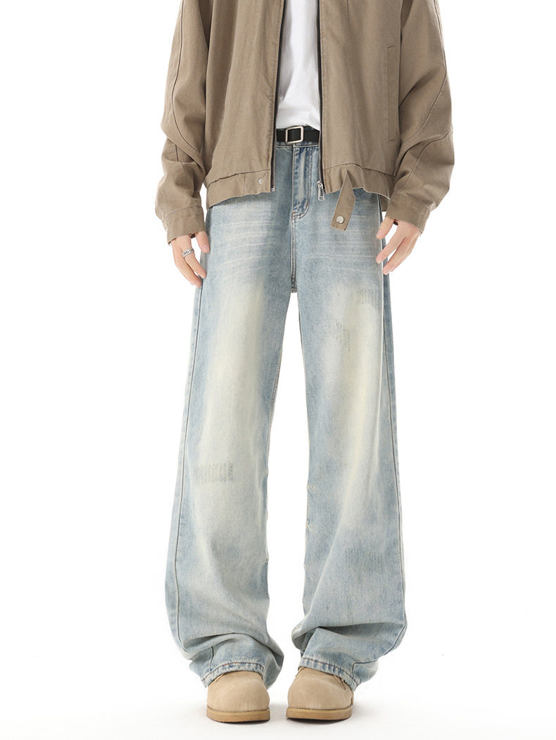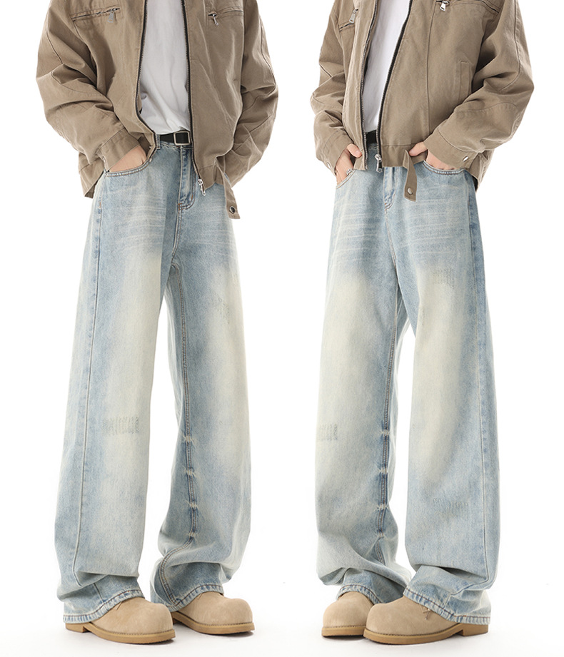 Muqiu 남성복 ∠ 미국 하이 스트리트 타이 플라워 빈티지 세탁 청바지 남성용 루즈 스트레이트 레그 와이드 레그 캐주얼 팬츠