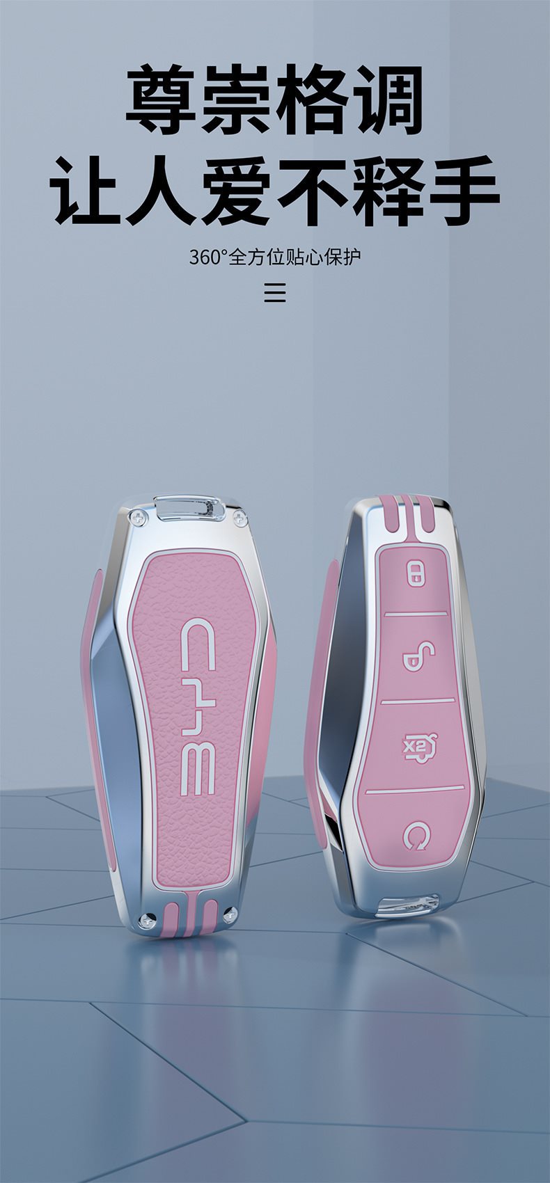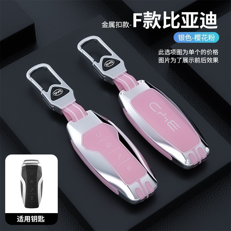 • BYD 모델 F-스마트 4버튼 [싱글 쉘 실버 핑크] + 자동차 로고 가죽 로프 버클 실버 핑크