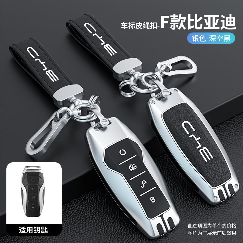 • BYD 모델 F - 스마트 4버튼 [싱글 쉘 실버 및 블랙] + 자동차 로고 가죽 로프 버클 실버 및 블랙