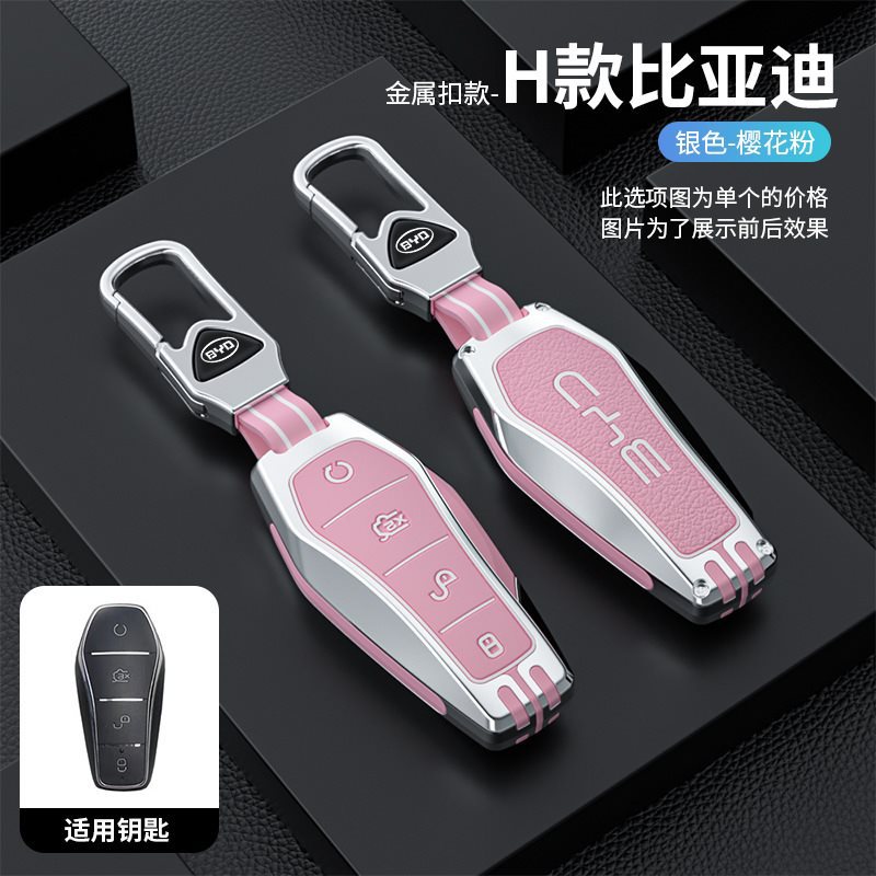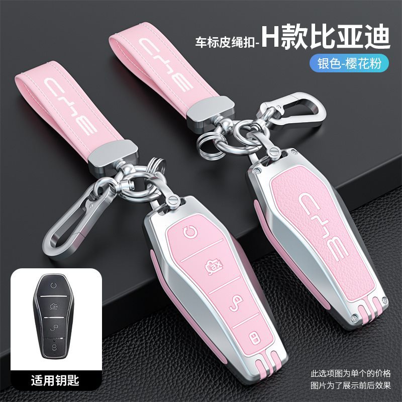 • BYD H 모델 - 스마트 4버튼 [싱글 쉘 실버 핑크] + 자동차 로고 가죽 로프 버클 실버 핑크