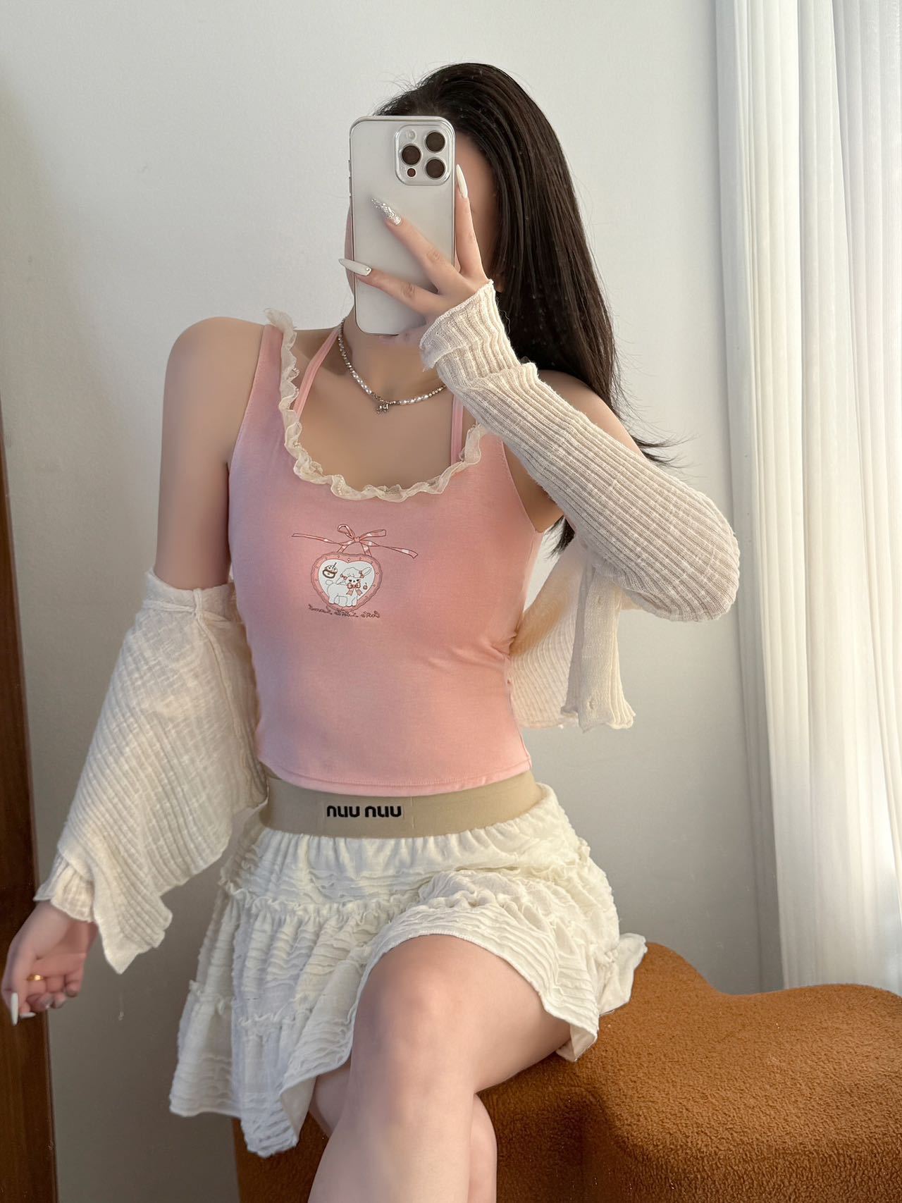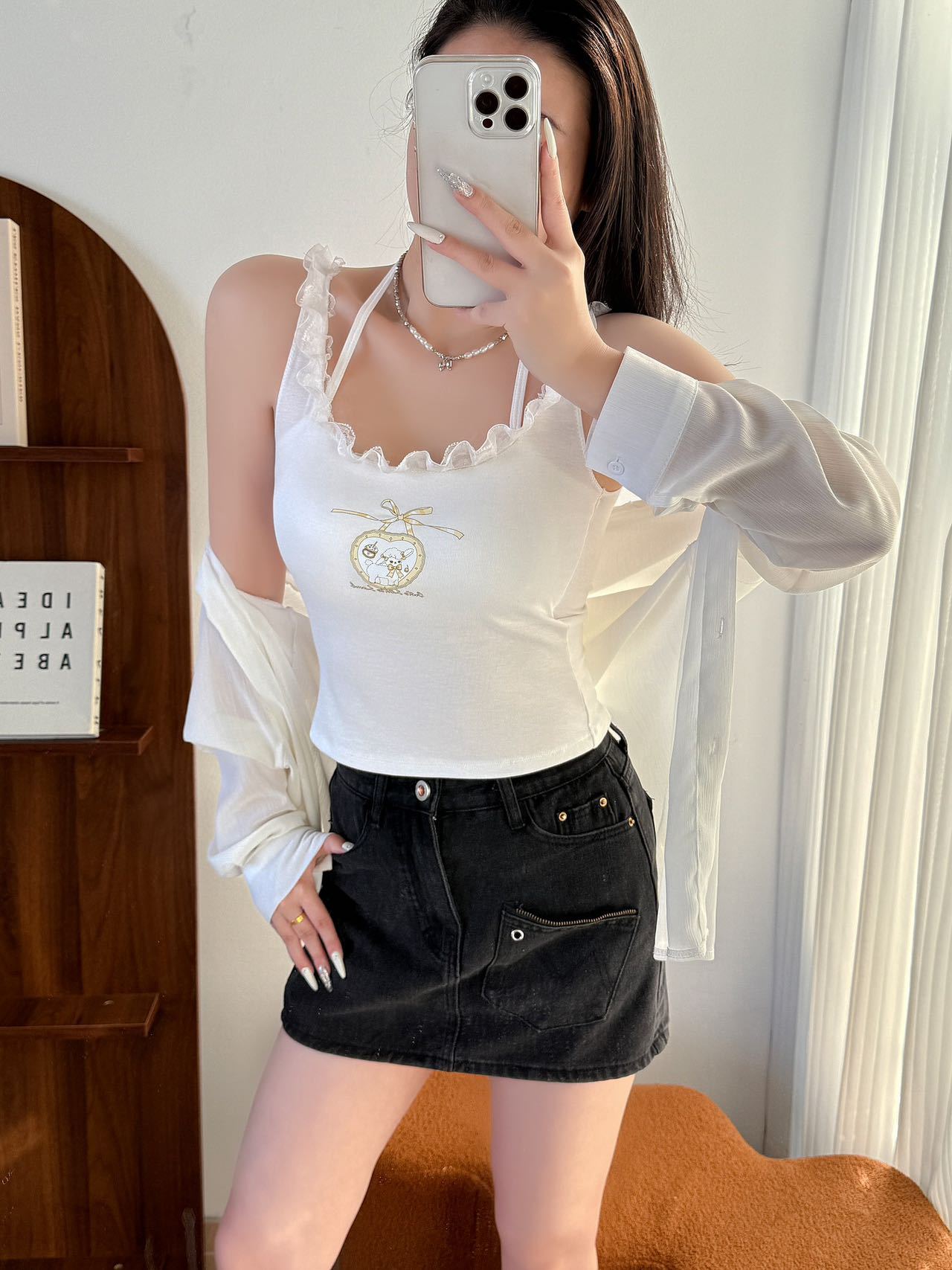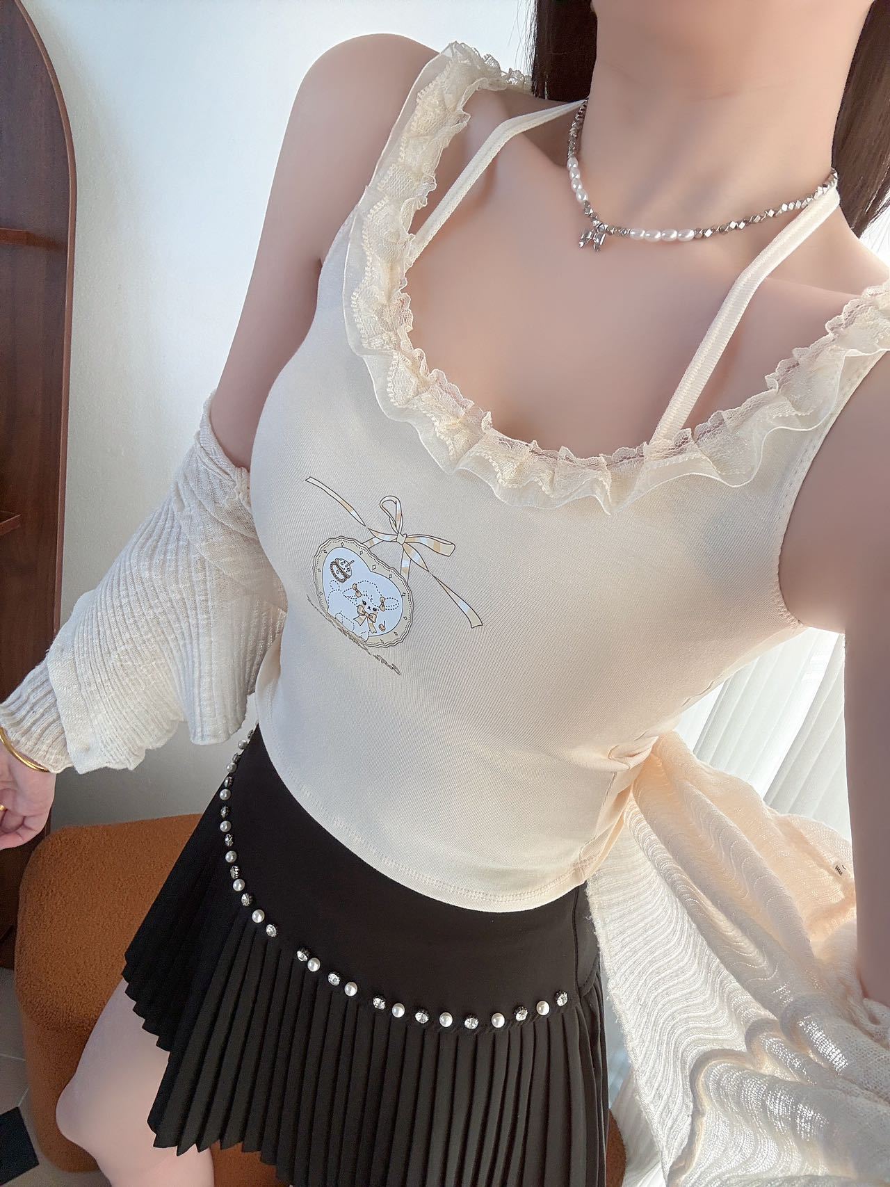 1816 # 새로운 스타일 코튼 넥 양고기 슬링 레이스 인쇄 짧은 상단 여성용 가슴 패드스토어 가기