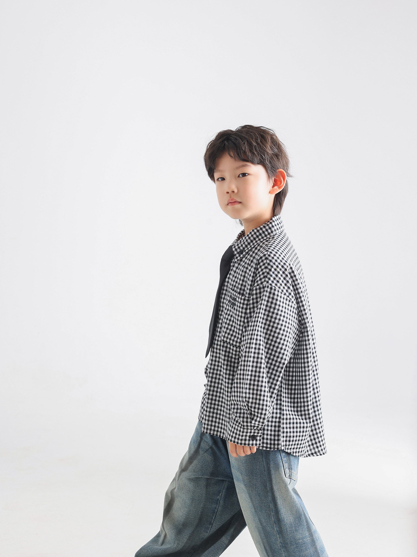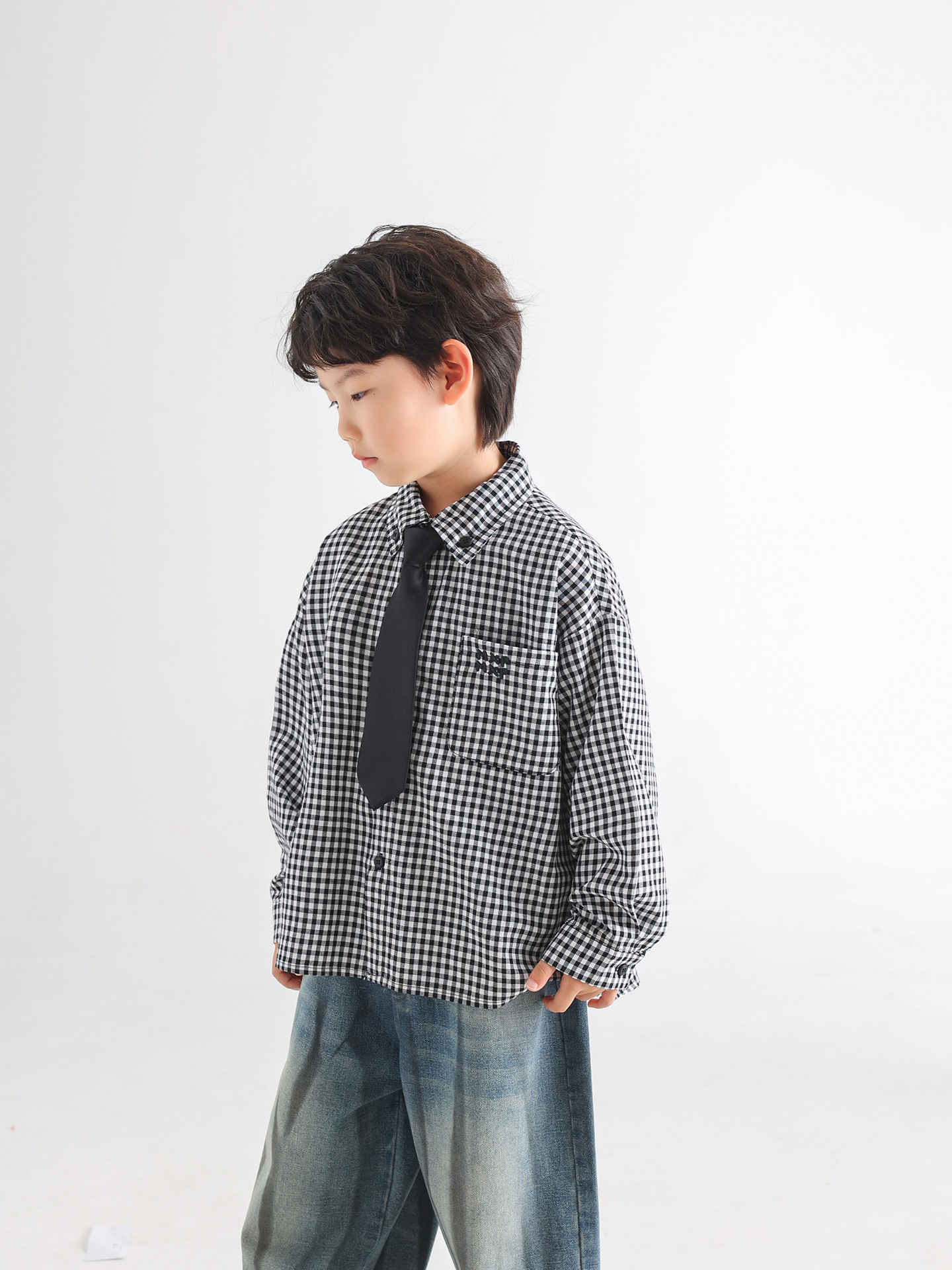 소년 가을 셔츠 2025 새로운 어린이 가을 한국 스타일 넥타이 격자 무늬 아동 의류 간단한 유행 느슨한 아기 셔츠
