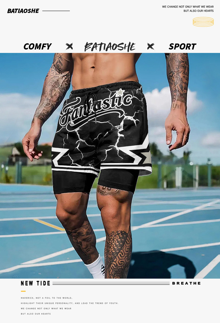 CP0974A03 미국 스포츠 반바지 남자 피트니스 빠른 건조 달리기 더블 레이어 가짜 2 피스 농구 훈련
