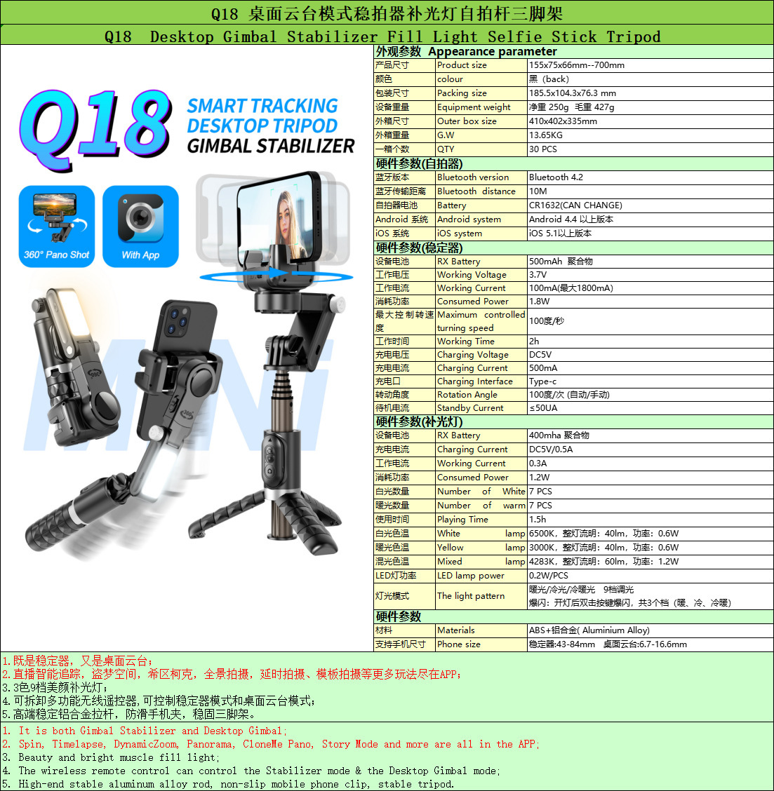국경 간 생방송 짐벌 안정기 삼각대 Q18 셀카 스틱 블루투스 흔들림 방지 후속 브래킷 개폐식