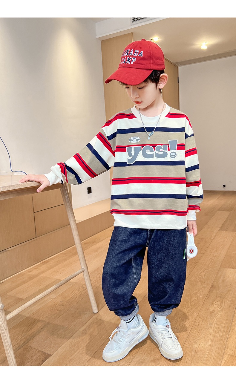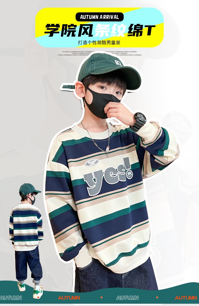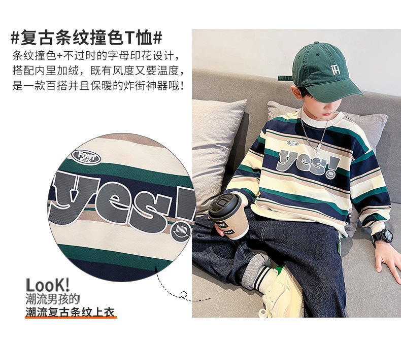 가을 새 어린이 둥근 목 땀 중소 소년 영어 편지 줄무늬 인쇄 싱글 피스 스포츠 캐주얼 탑