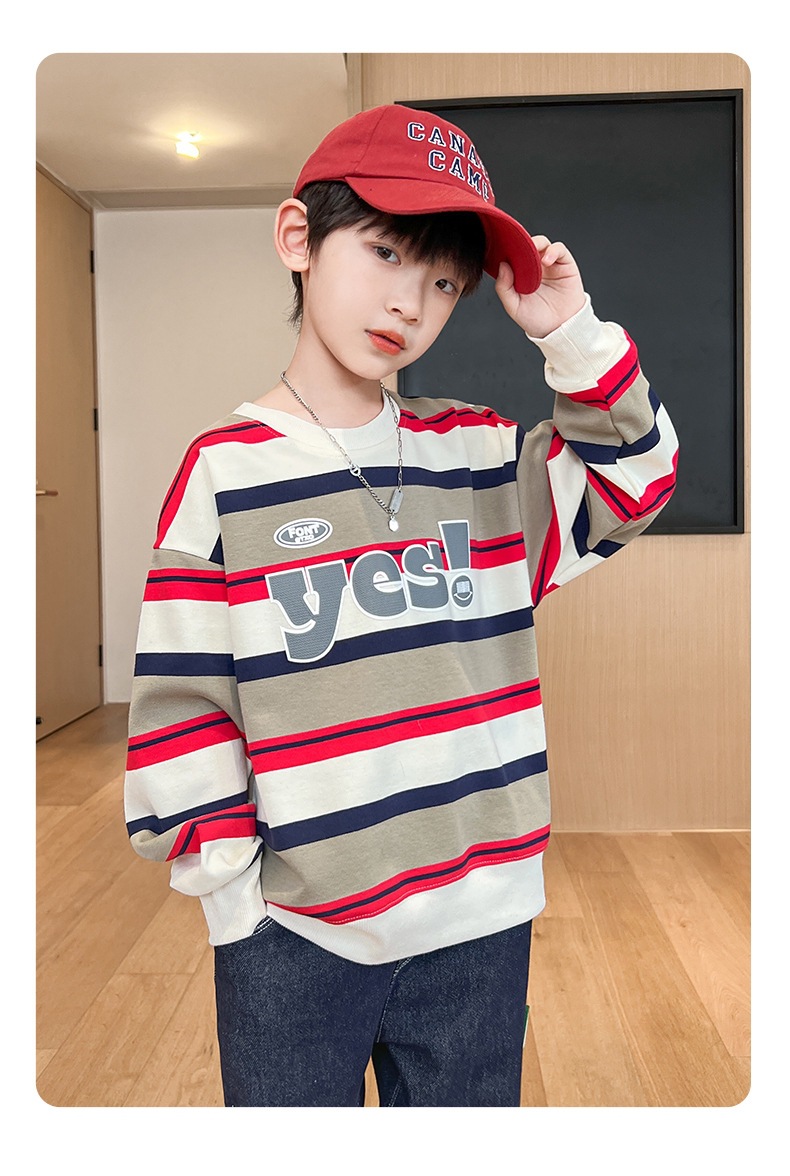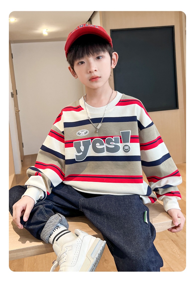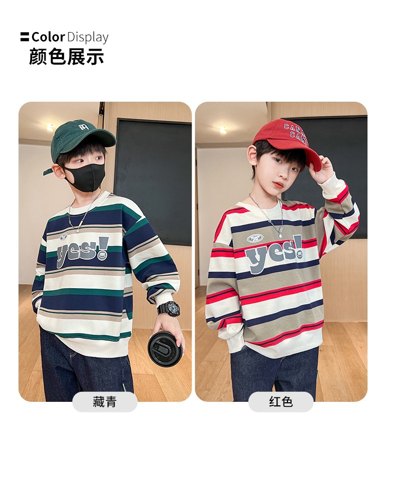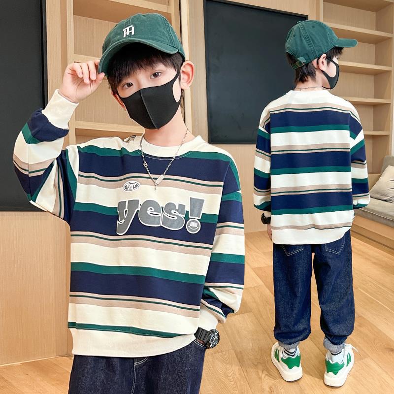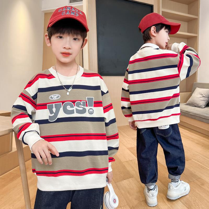 가을 새 어린이 둥근 목 땀 중소 소년 영어 편지 줄무늬 인쇄 싱글 피스 스포츠 캐주얼 탑스토어 가기