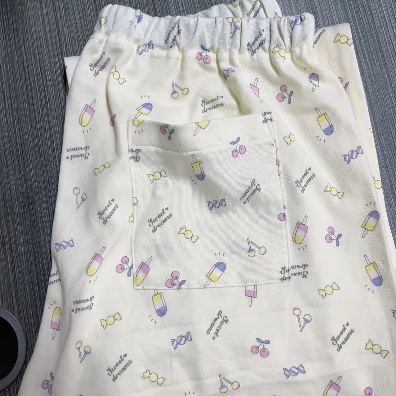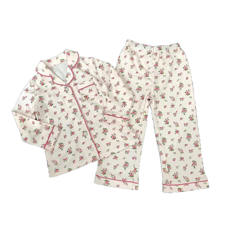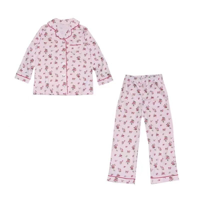 出口单剩余女孩家居服套装,100%棉,棉毛面料,柔软亲肤舒适,碎花系列,4个颜色,110-160码,不偏小,剪标/无标。均属正常,平铺尺寸如下