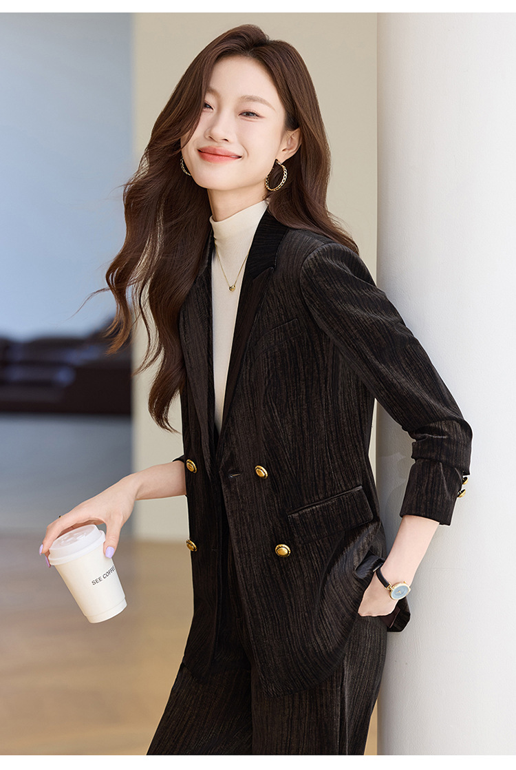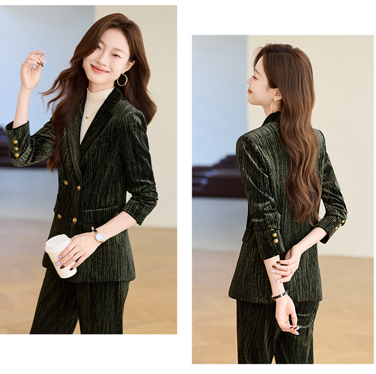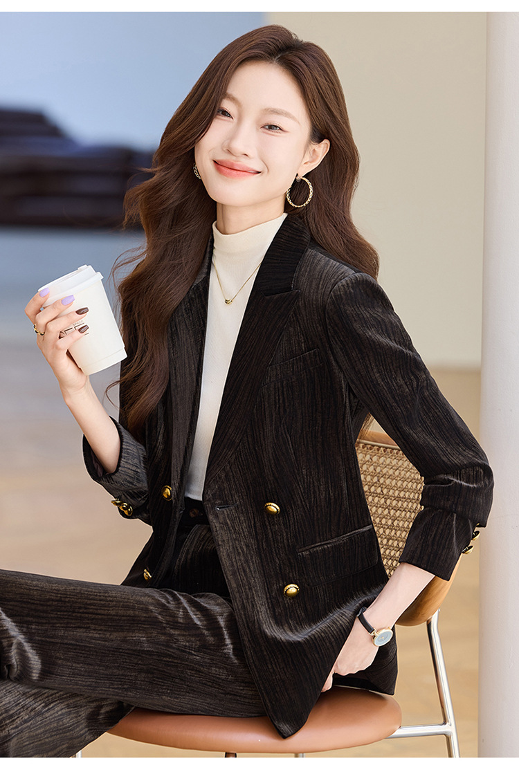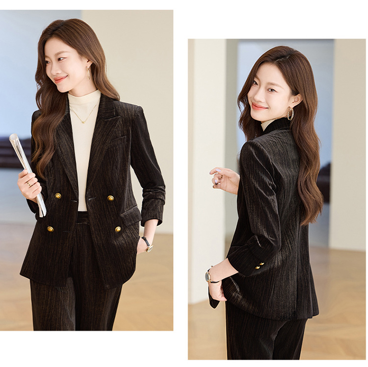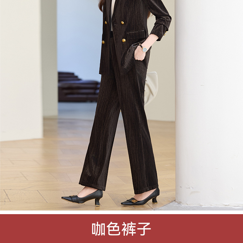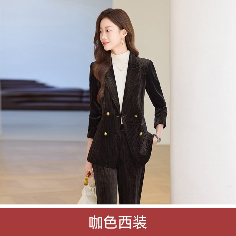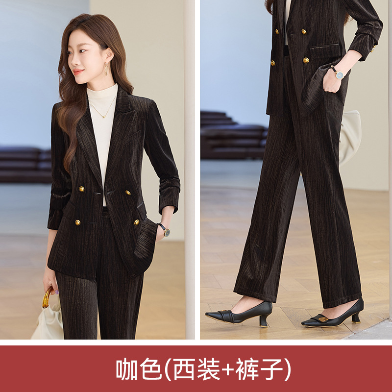 패션 세트 더블 브레스트 다크 브라운 유능한 기질 여성 비즈니스 골드 벨벳 세트 비즈니스 투피스 세트