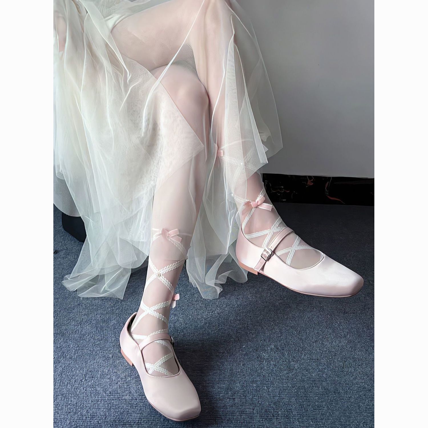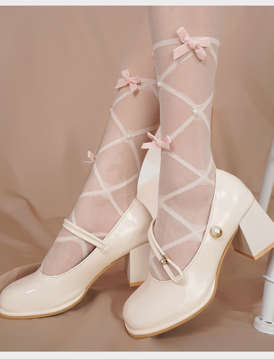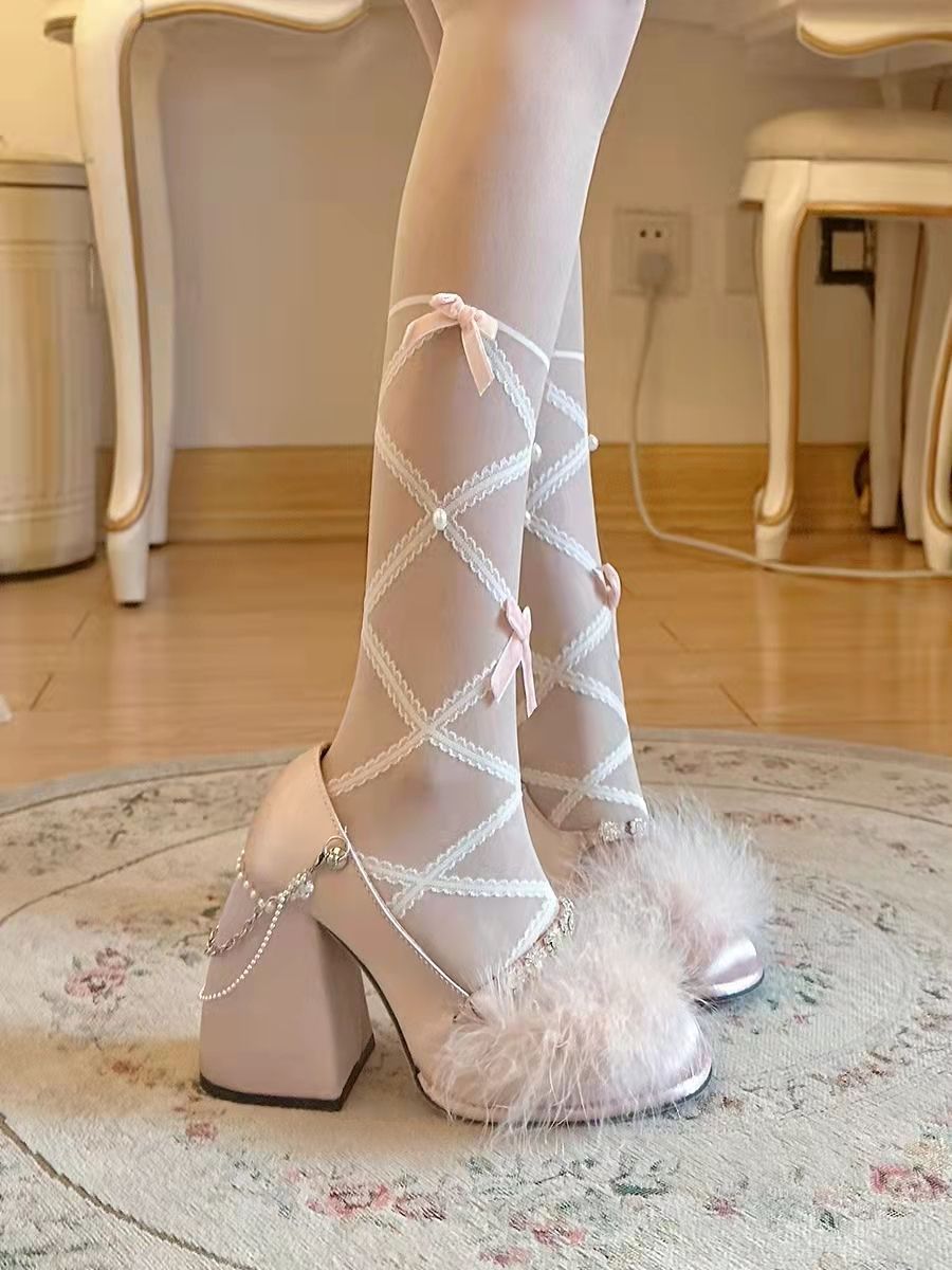 봄과 여름 일본 순수 로리타 크로스 스트랩 화이트 실크 소녀 달콤한 벨벳 활 다이아몬드베이스 양말 얇은스토어 가기