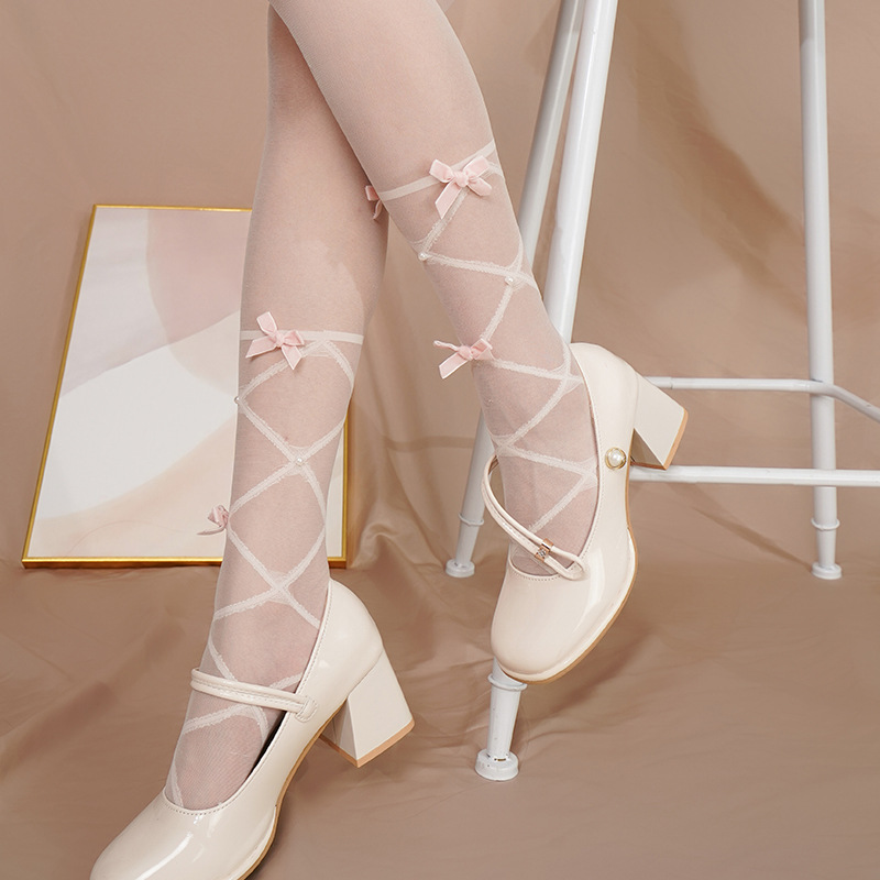 봄과 여름 일본 순수 로리타 크로스 스트랩 화이트 실크 소녀 달콤한 벨벳 활 다이아몬드베이스 양말 얇은