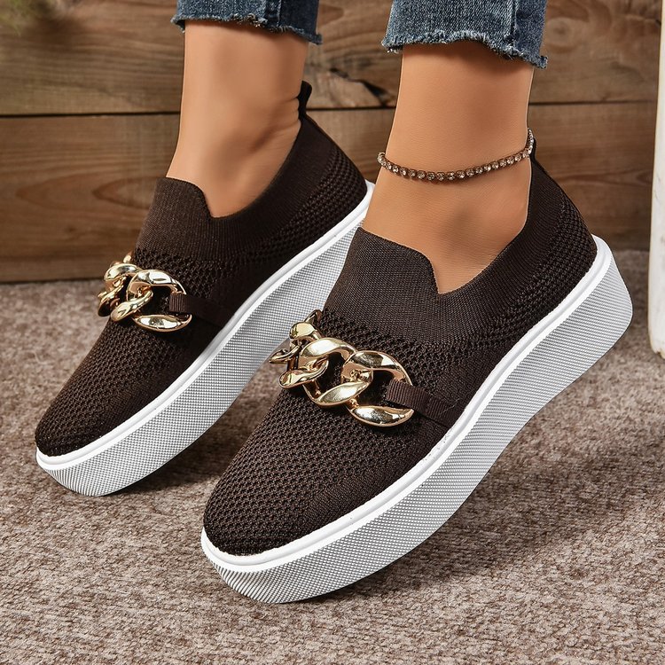 2024 봄과 가을 새로운 유럽과 미국의 두꺼운 싱글 슈즈 플라잉 짠 스포츠 여성 금속 체인 캐주얼 싱글 슈즈 로퍼