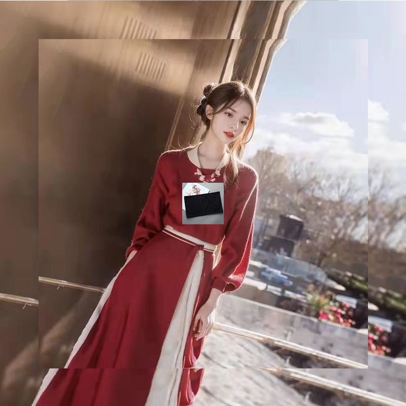 새 중국 스웨터 원피스 여자 가을 · 겨울 중장 한후 개선 청삼 고급 신년 붉은 니트 원피스