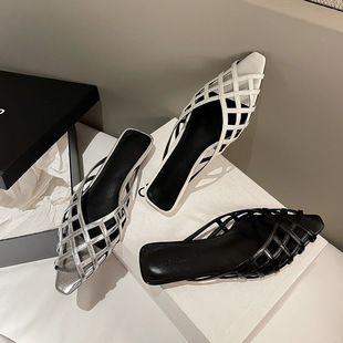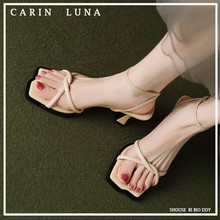 蝴蝶结细带气质2022韩版方头高跟带交叉凉拖成年一字型订货小牛皮