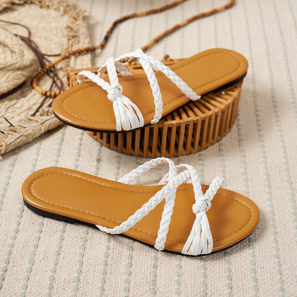 유럽과 미국의 대외 무역 플러스 사이즈 플랫 오픈 발가락 슬리퍼 여성용 간단한 꼰 크로스 벨트 경량 비치 샌들 슬리퍼