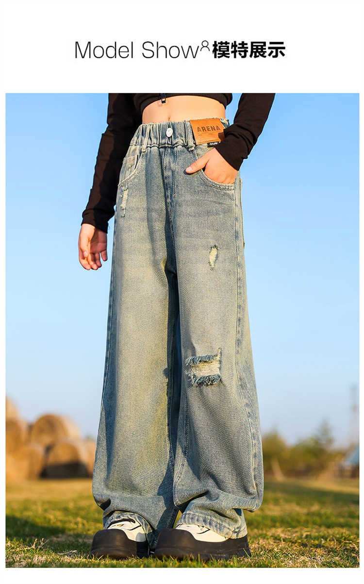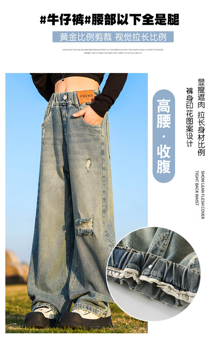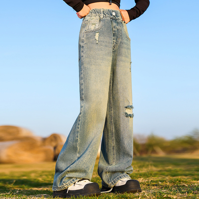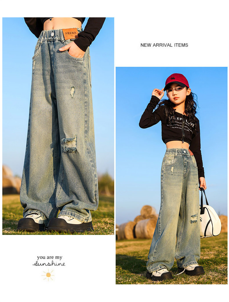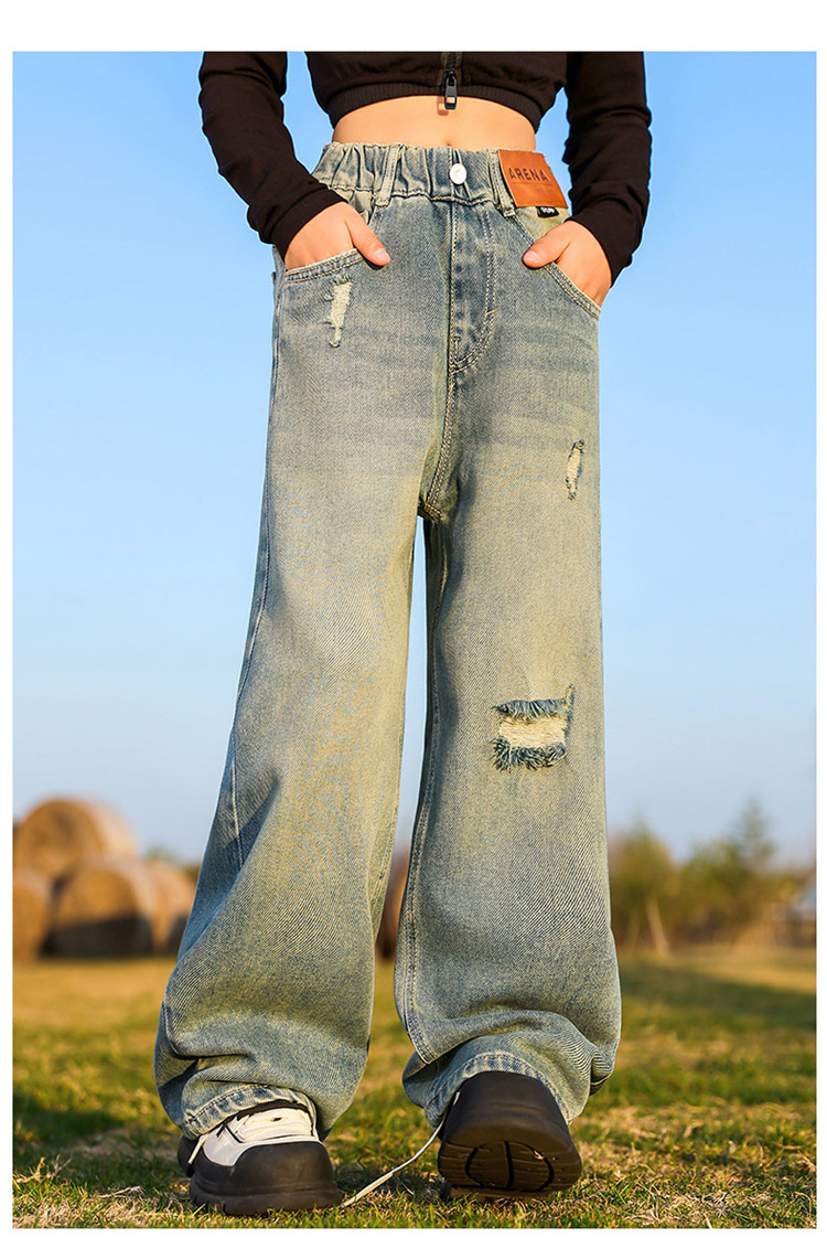 소녀 청바지 봄과 가을 2025 새로운 어린이 스트레이트 와이드 다리 바지 봄 원피스 소녀 캐주얼 리핑 바지스토어 가기