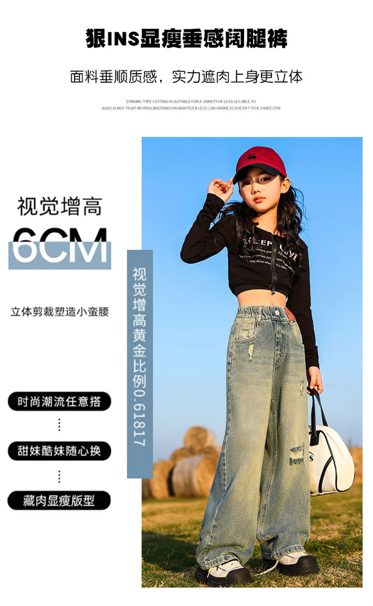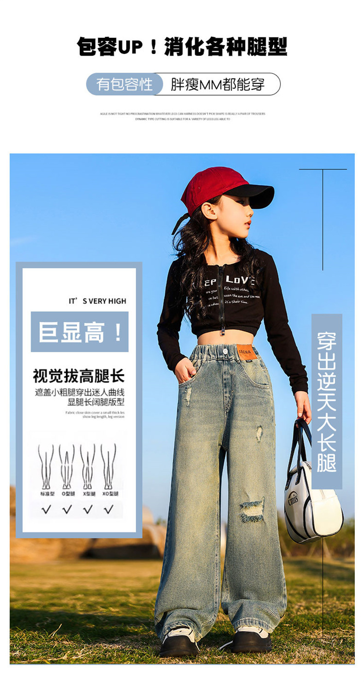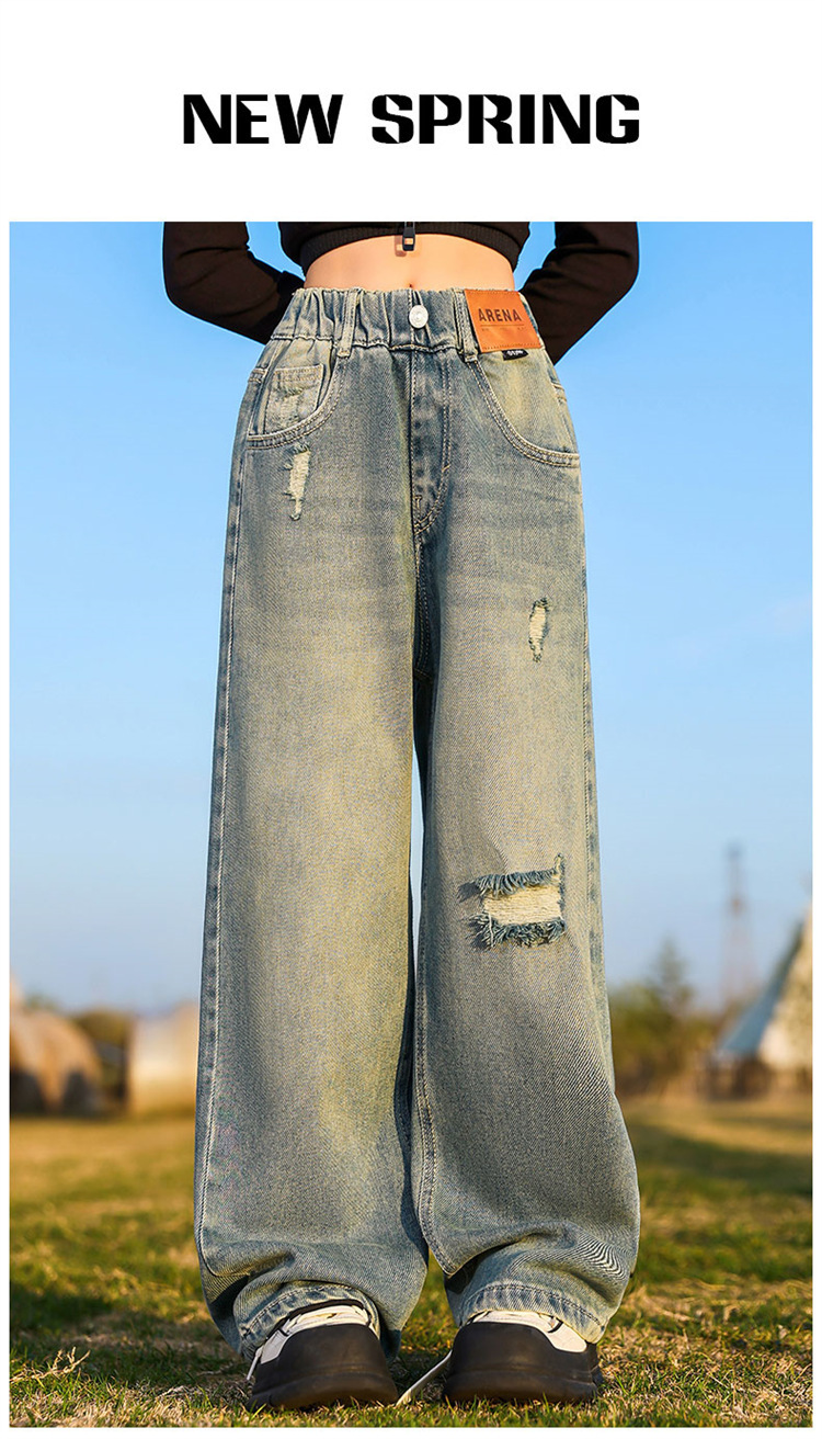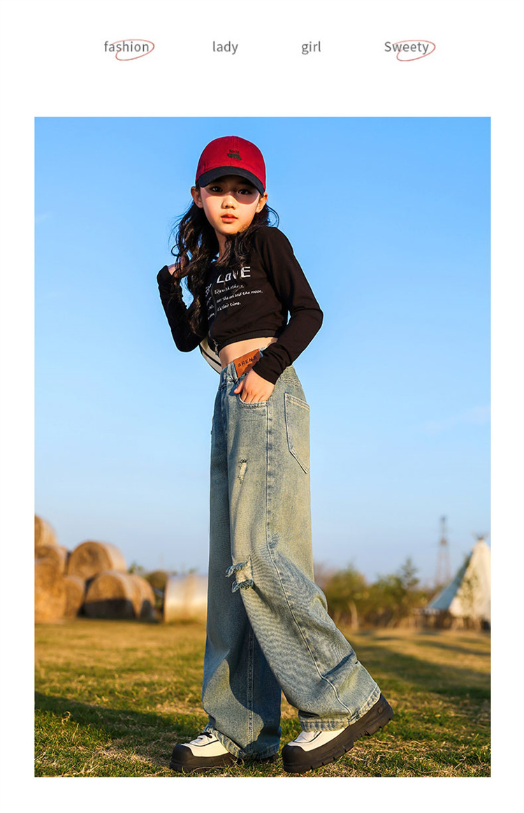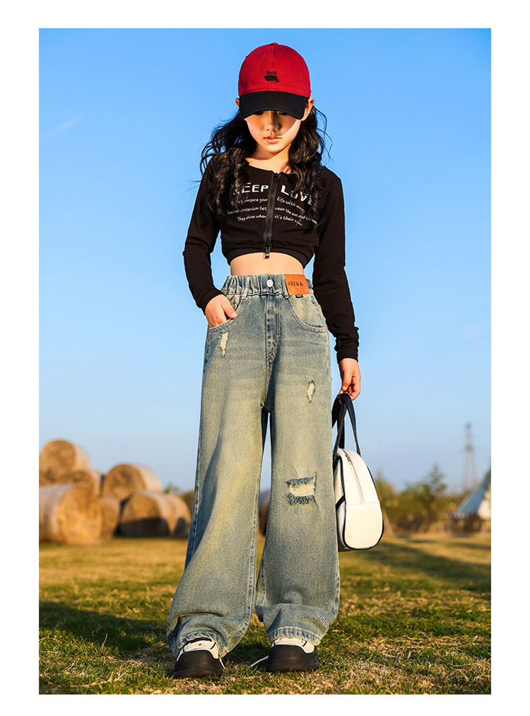 소녀 청바지 봄과 가을 2025 새로운 어린이 스트레이트 와이드 다리 바지 봄 원피스 소녀 캐주얼 리핑 바지스토어 가기