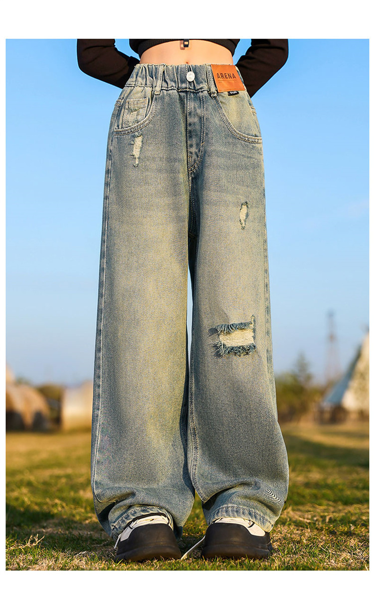 소녀 청바지 봄과 가을 2025 새로운 어린이 스트레이트 와이드 다리 바지 봄 원피스 소녀 캐주얼 리핑 바지