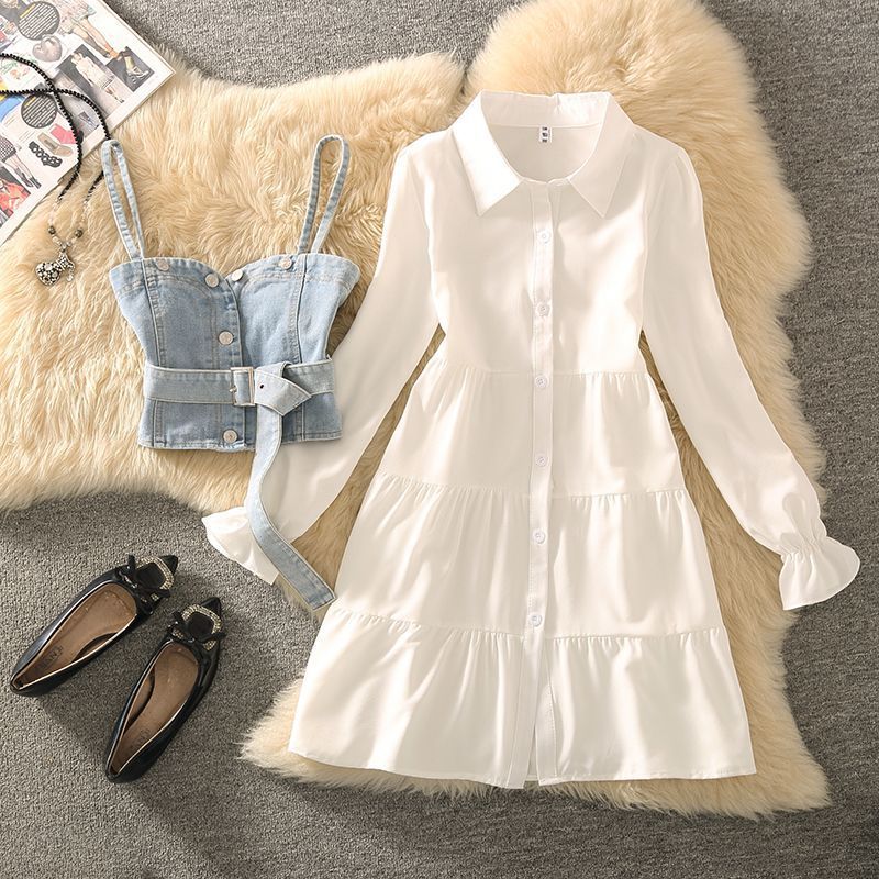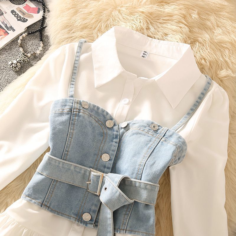 프랑스 스타일 틈새 퍼프 슬리브 원피스 여성 2025 디자인 센스 셔츠 원피스 데님 조끼 투피스 세트
