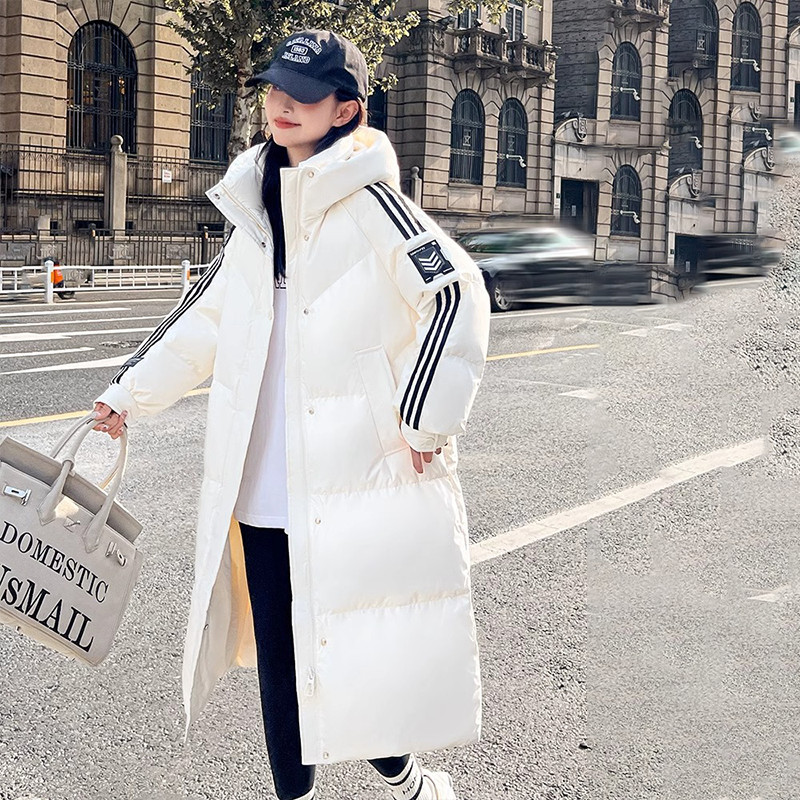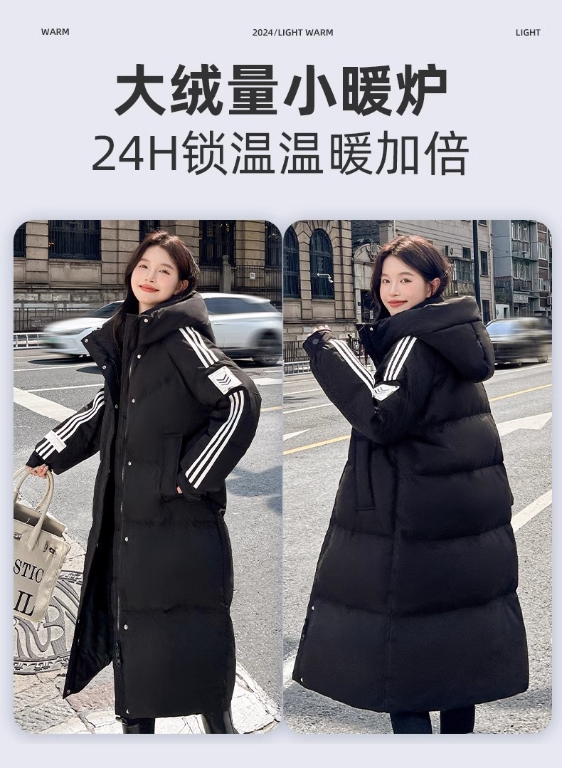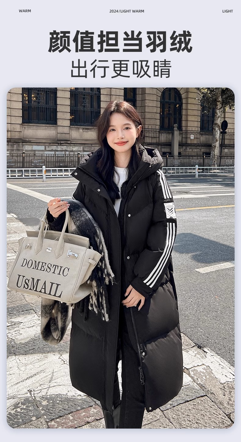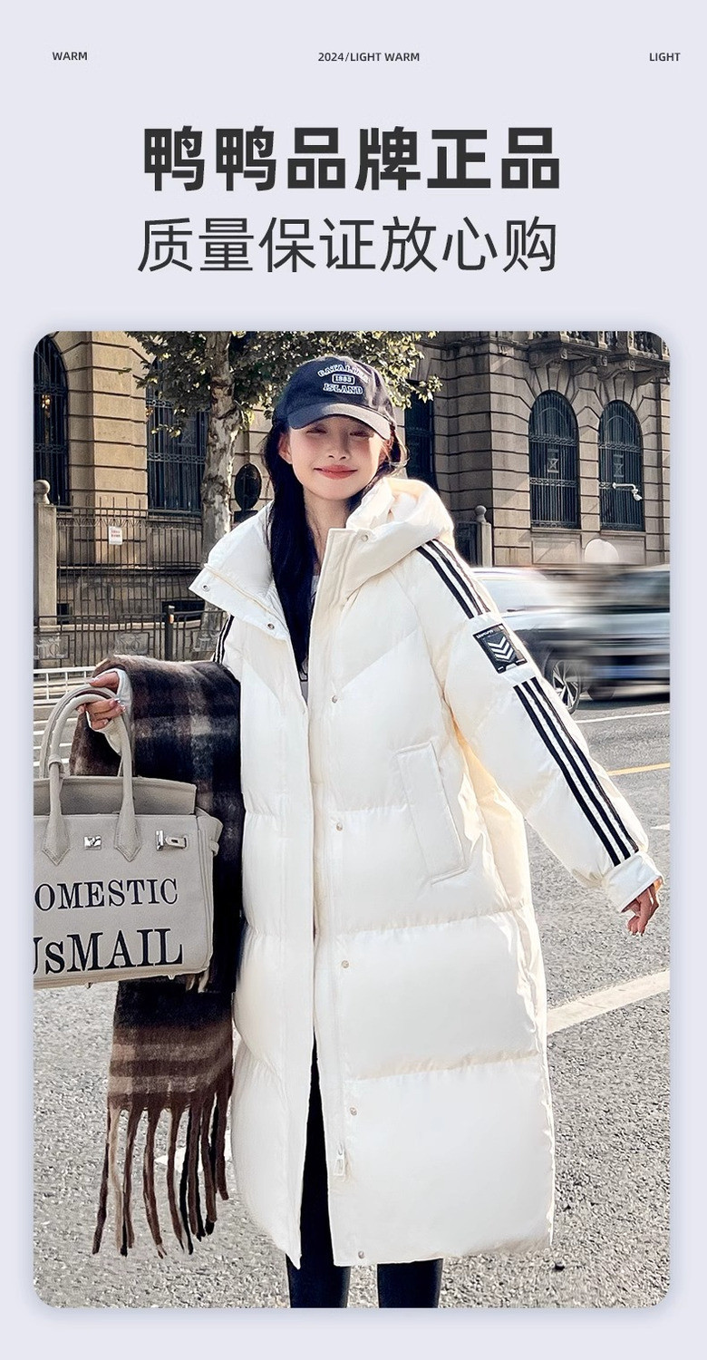 두꺼운 따뜻한 긴 무릎 위 다운 재킷 여성의 2024 겨울 새로운 브랜드 폭발 두꺼운 따뜻한 후드 줄무늬스토어 가기