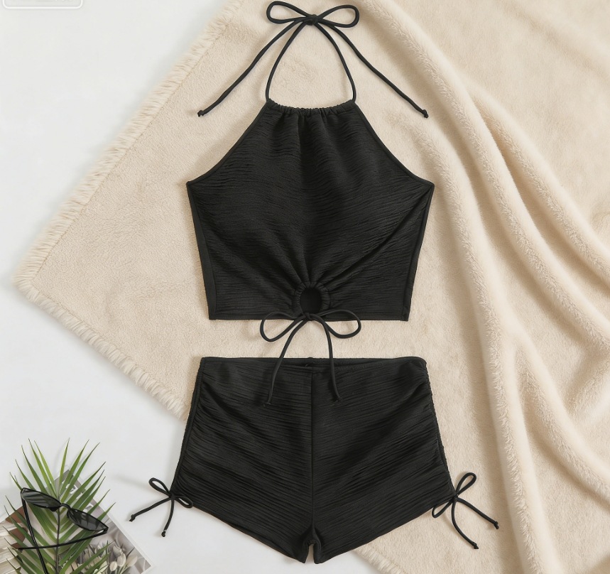 2025 새로운 분할 수영복 여성의 섹시한 목 스트랩 드로우 비키니 할로우 비치 휴가 대외 무역 수영복스토어 가기