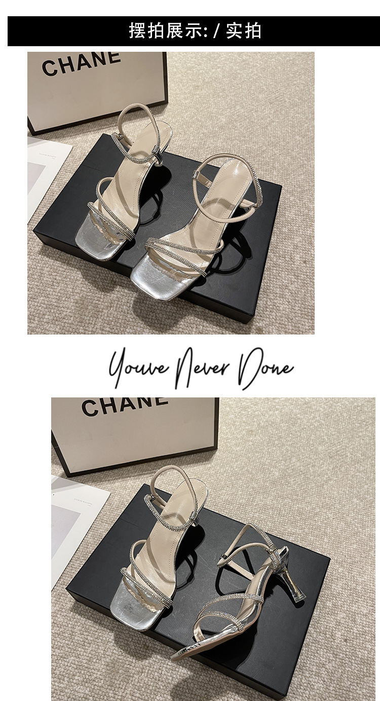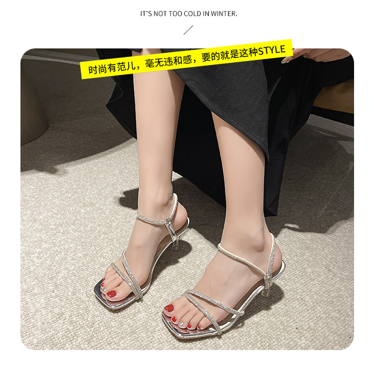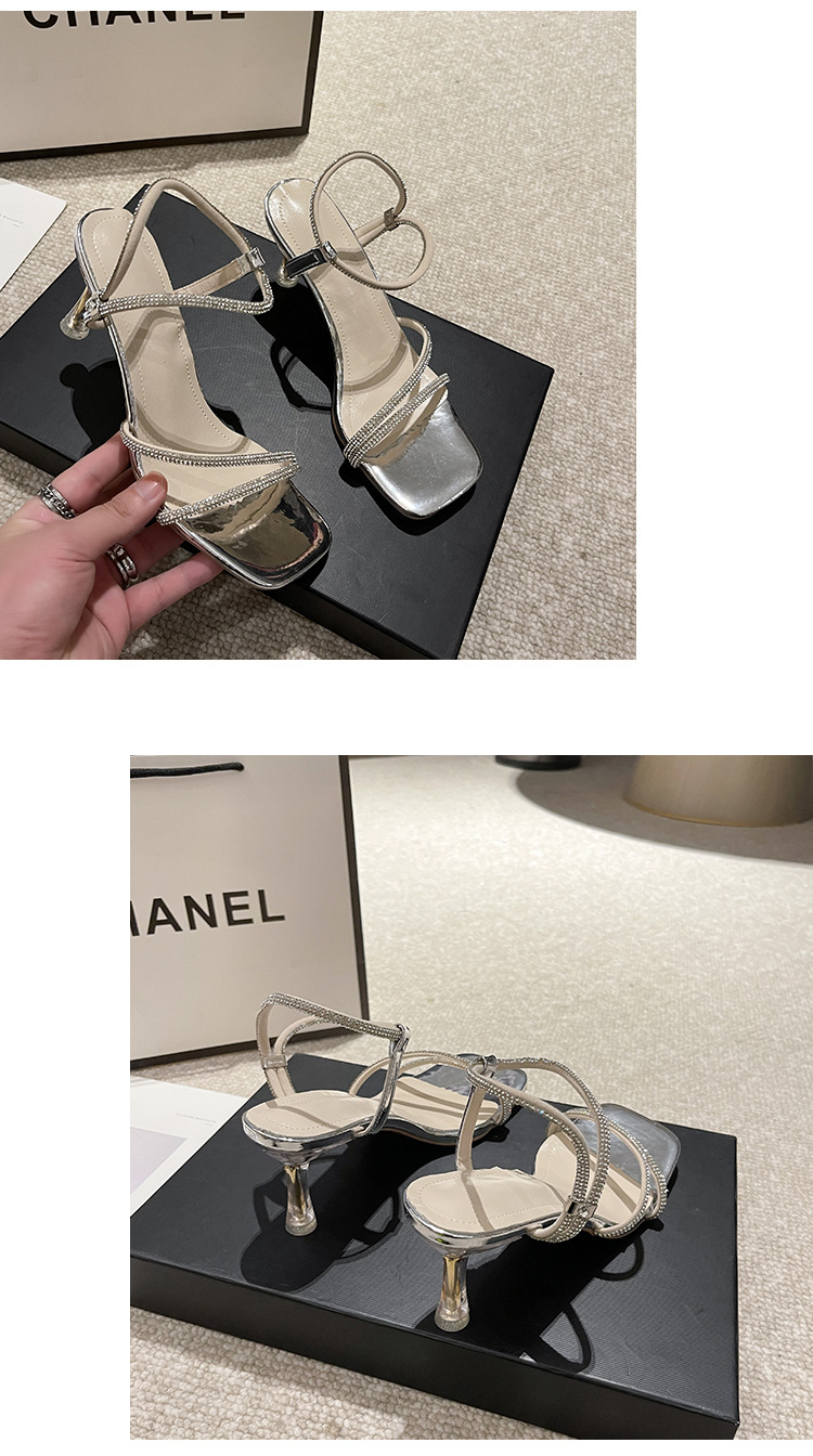2024 년 여름 새로운 라인스톤 실버 간단한 연회 신발 여성용 샌들 버클 스트랩 스틸레토 힐 오픈 발가락 하이힐스토어 가기