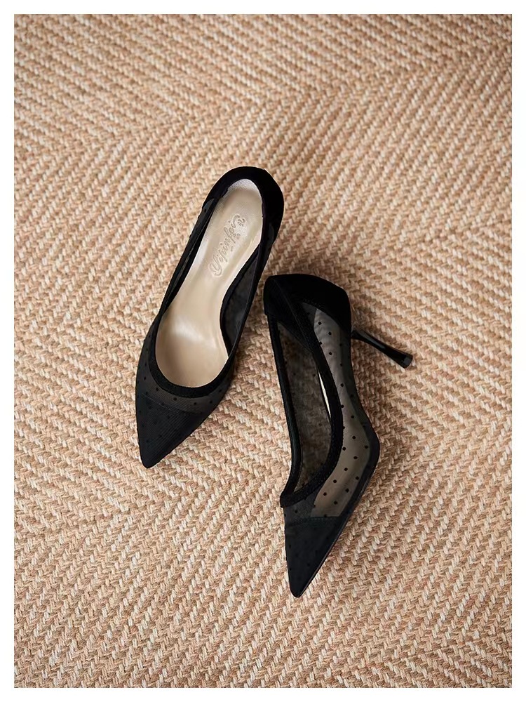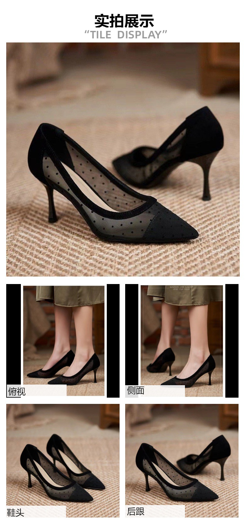 싱글 신발 요정 스타일 2023 여름 새로운 사이버 인기 하이힐 포인팅 톤 레이스 폴로 도트 패션 여성 신발스토어 가기