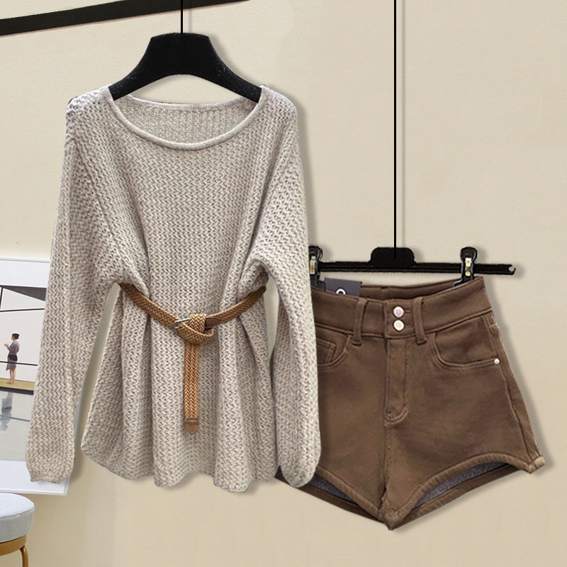 올해 인기있는 여성 2024 가을과 겨울 새로운 느슨한 나이 감소 스웨터 하이 허리 데님 반바지 투피스 세트 세트스토어 가기